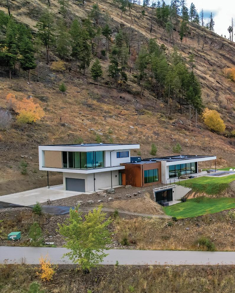 “While we wanted the house to be an architectural statement, we also wanted it to belong to the landscape,” says Chris. “The grass is native hydroseed, and the surroundings are kept natural. Down below, you’ll notice how the basement suite is built right into the hillside.”