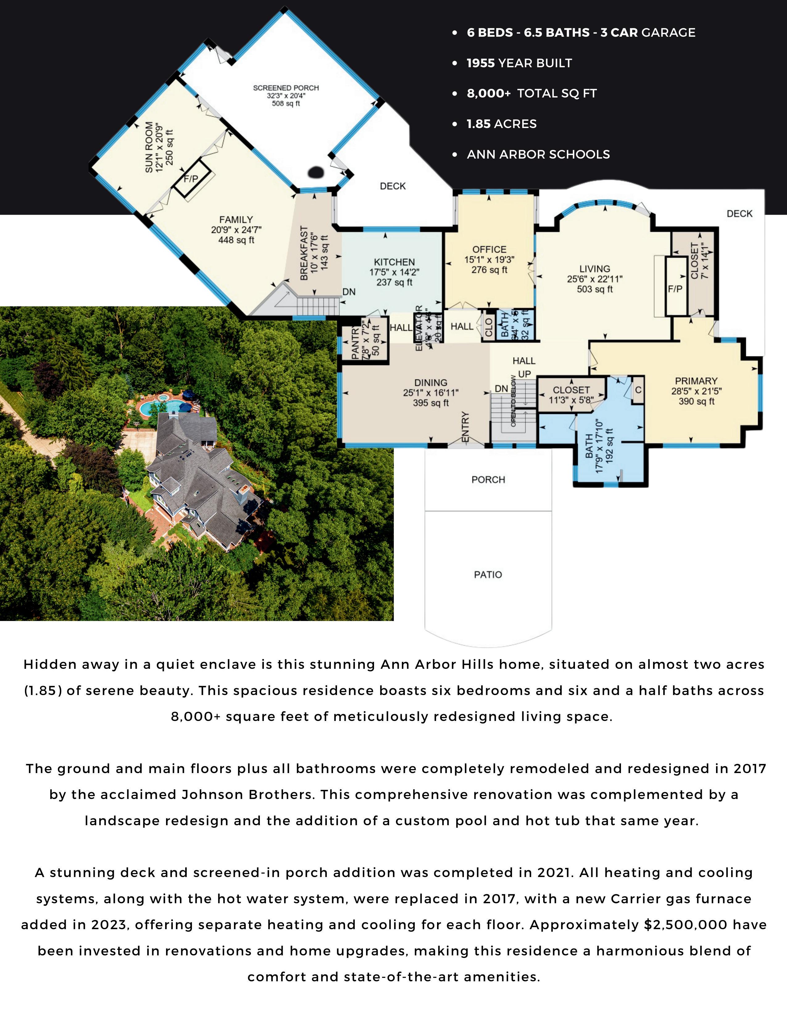 Hidden away in a quiet enclave is this stunning Ann Arbor Hills home, situated on almost two acres (1.85) of serene beauty. This spacious residence boasts six bedrooms and six and a half baths across 8,000+ square feet of meticulously redesigned living space.