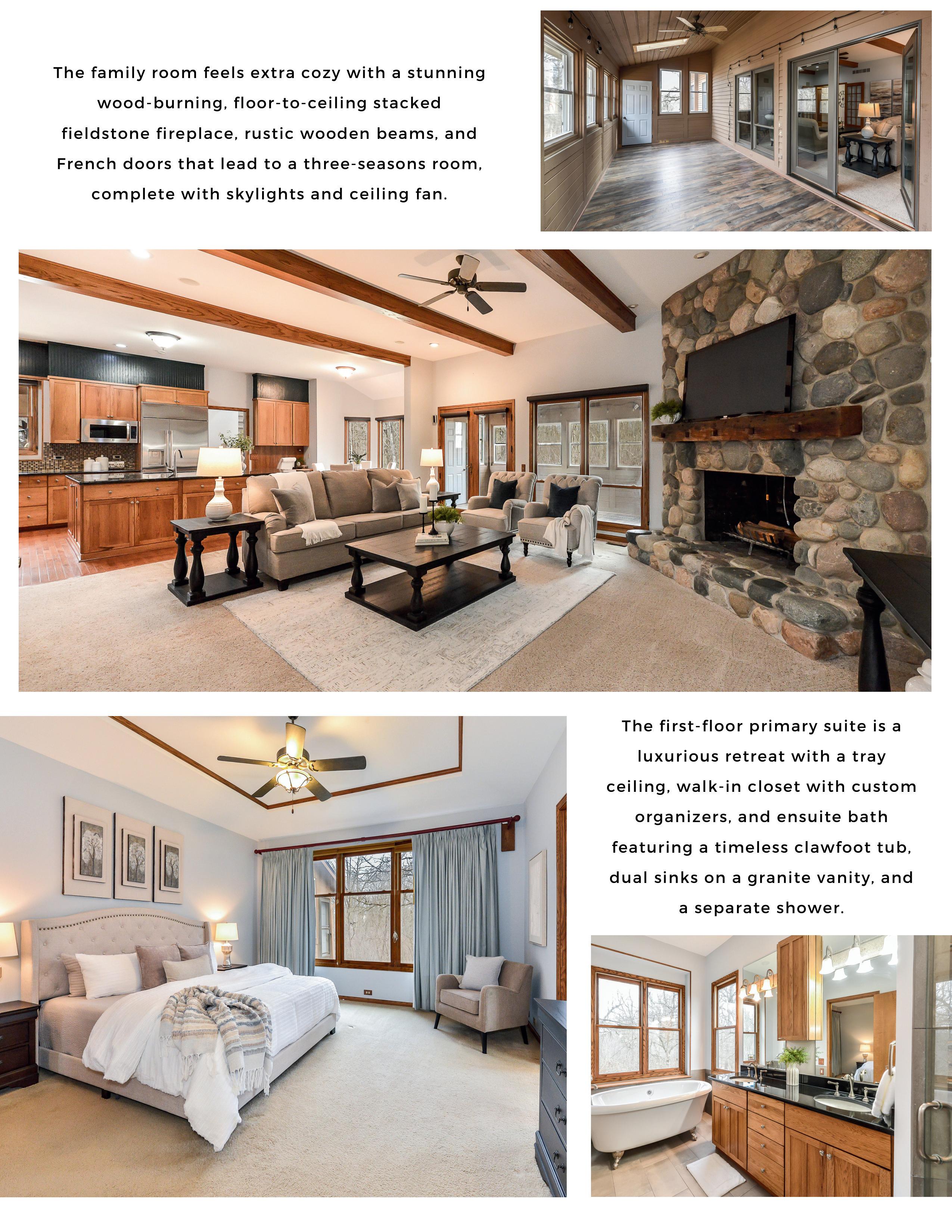 Spanning over 11 acres and encircled by enchanting woods, this property promises a serene living experience that feels miles away from the bustle of everyday life. The residence exudes a quintessential ''up North'' lodge ambiance, both inside and out, characterized by its cedar facade and delightful, covered porch extending across the home's entire front.