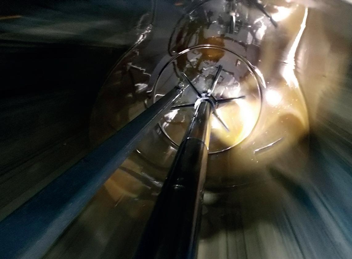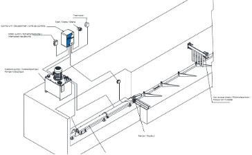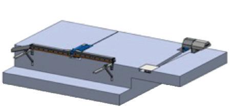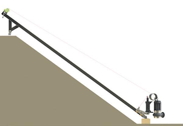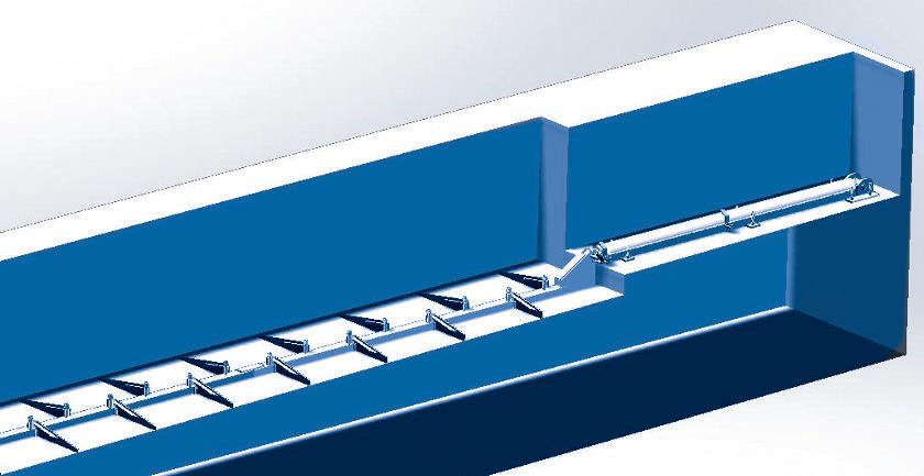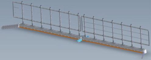 Zwei parallele Rinnen von 0,5 m Länge im Abstand von 0,2 m zu einer Mittelwand. Der Antrieb zum Ziehen der Last befindet sich oben auf der Rampe. Das Getriebe wird dadurch weniger beansprucht. Die Leistung der Antriebseinheit beträgt 3 kW. Die 180°-Umlenkrolle ist auf einem hochfesten Bronzering montiert. Sie befindet sich am Ende der Rinne und ermöglicht müheloses Drehen der Kette.