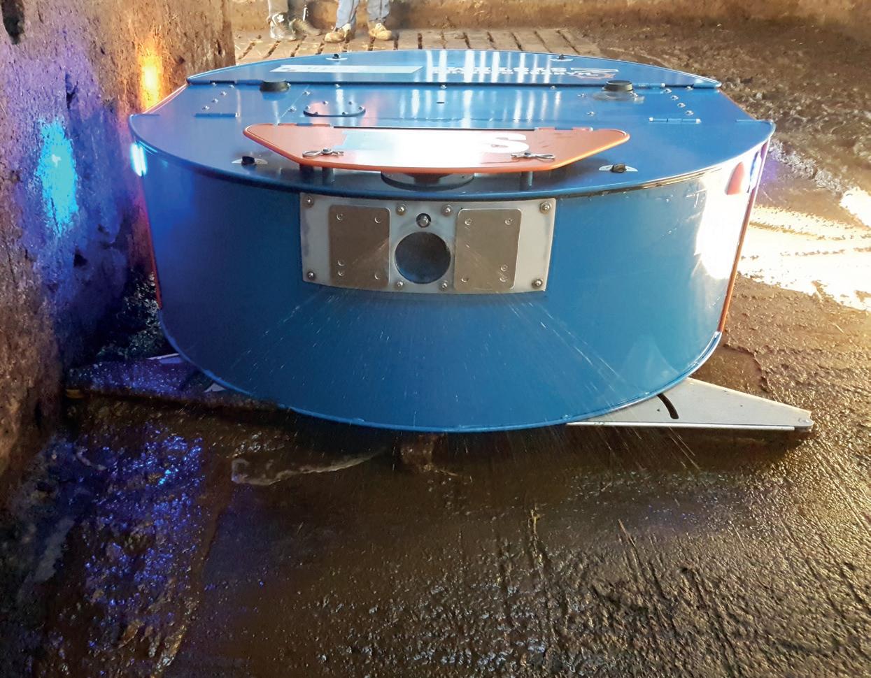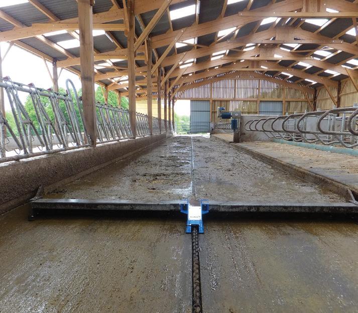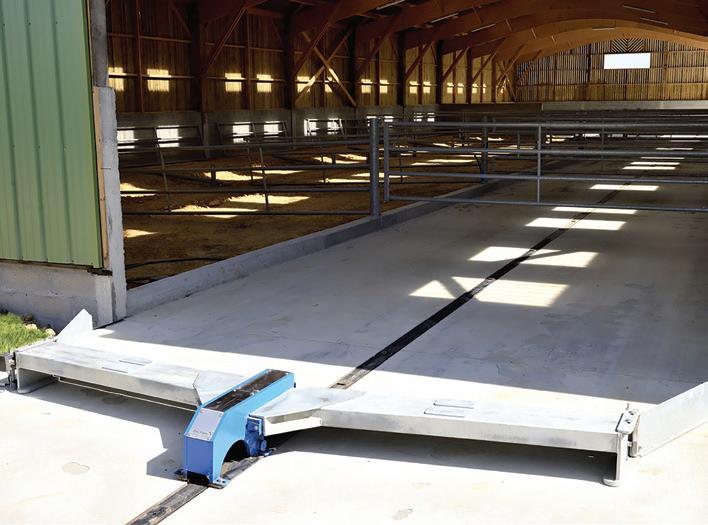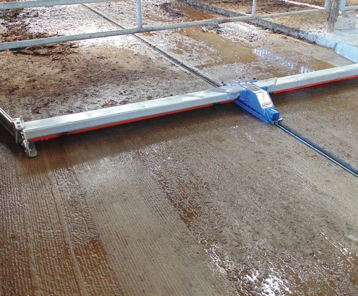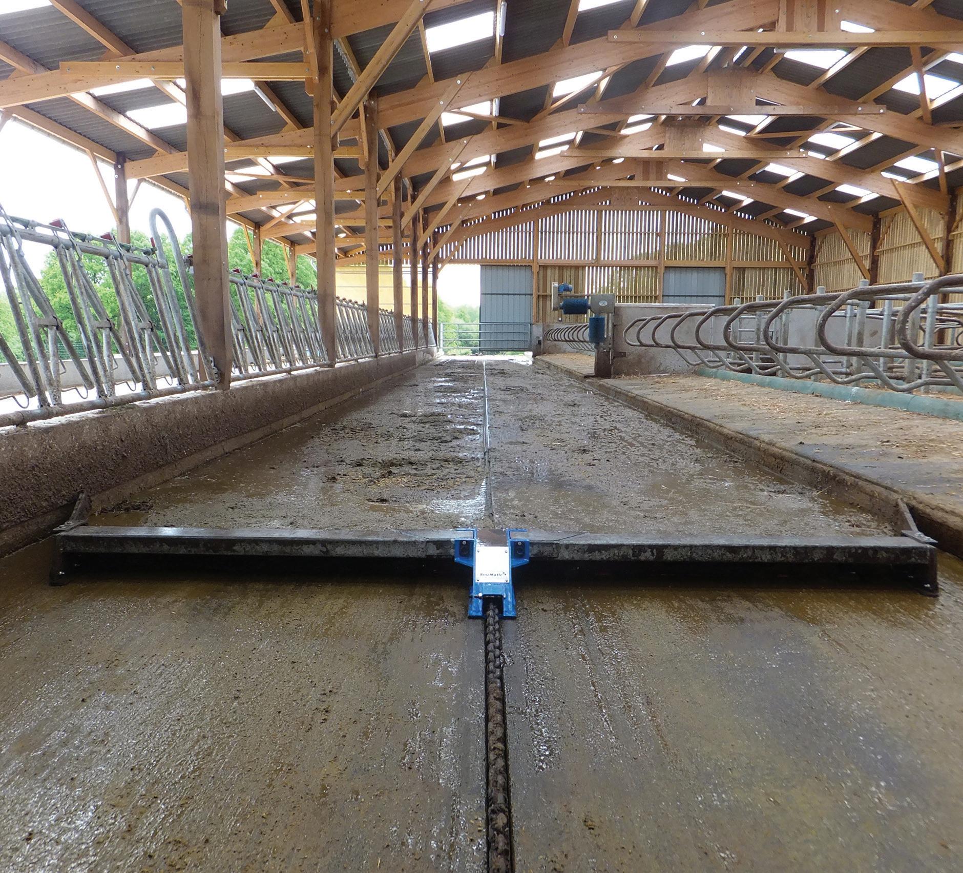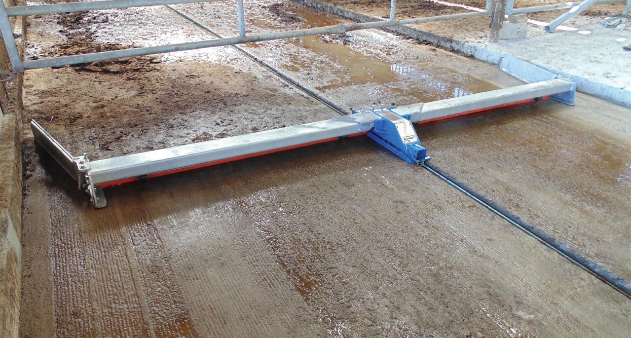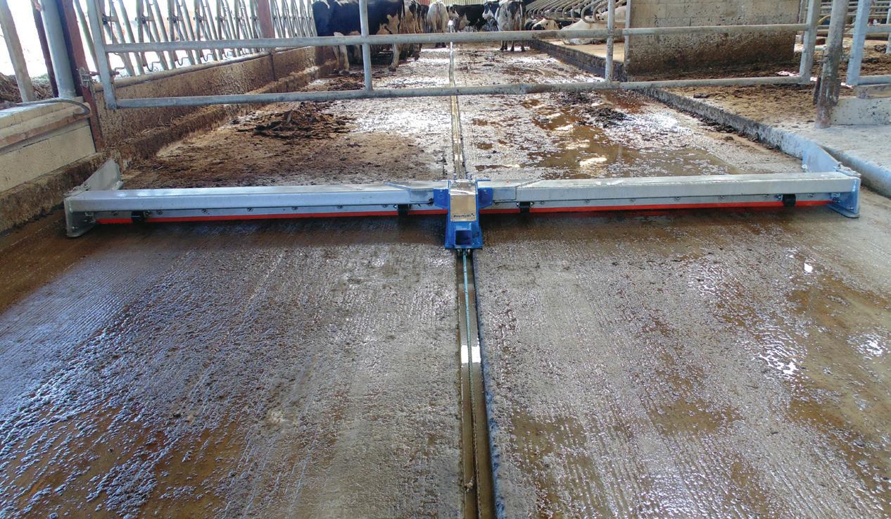 Der Falcon Cross ist in der Lage, auch schwerste Lasten zu schieben. In einem Kanal von 1,15 m bei Doppelreihe oder 0,635 m bei Einschienenbahn schiebt er den Mist, den der Schieber abtransportiert.