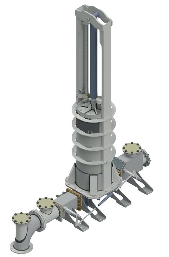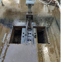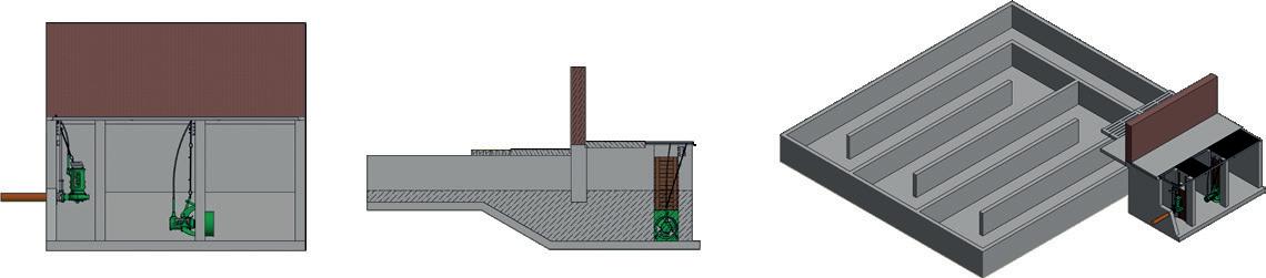 Anlage mit einem Spülkanal und einer Auffanggrube am Ende mit einer vertikalen Pumpe zum Spülen.