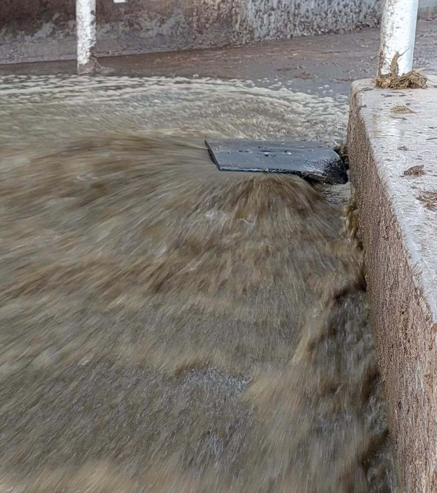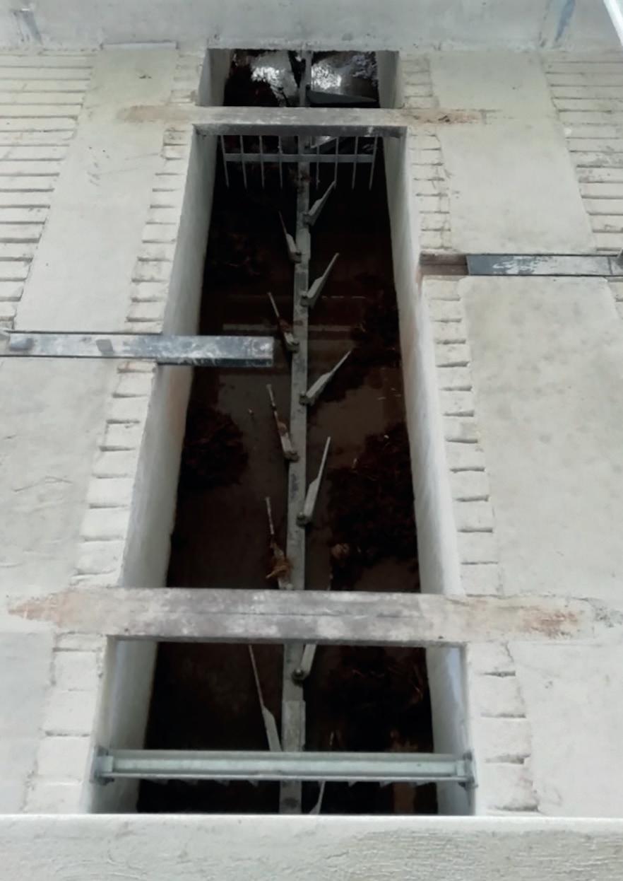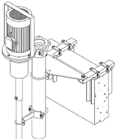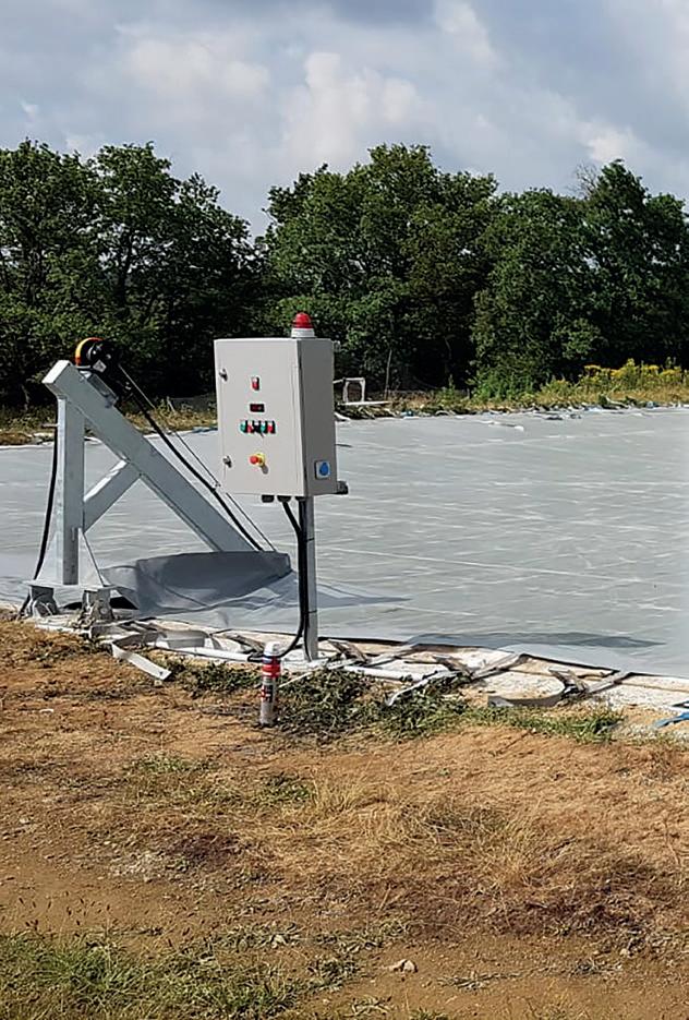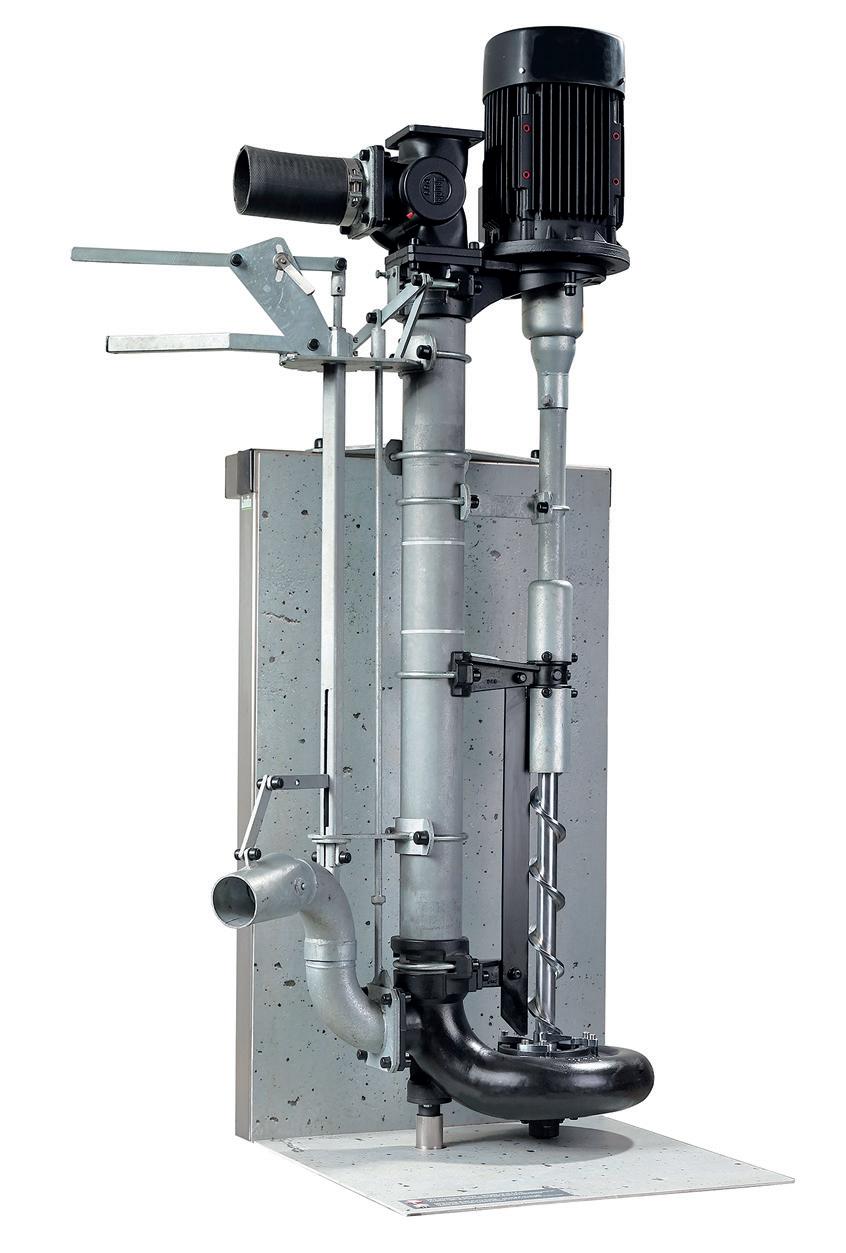 Der abgeschiedene flüssige Teil fällt in den Kanal und wird in die zylindrische Grube abgeleitet. In der Grube befinden sich eine Pumpe mit vertikaler Achse zum Spülen und ein Mischer zur Homogenisierung der Gülle.