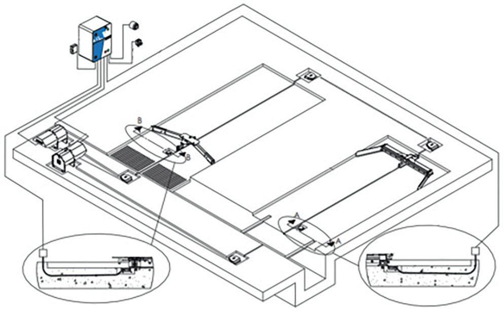 Eingelassen: zur Verwendung in Schubversion. Das Gestell wird 18 cm unter der Betonebene des Schiebergangs eingelassen. Er wird in Schubposition platziert, d. h. am Anfang des Schiebergangs.