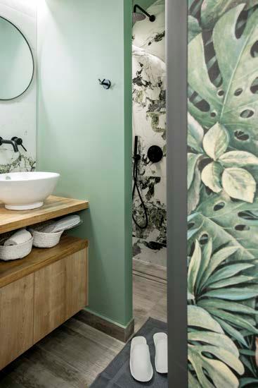 «Για τον κύριο χώρο επιλέγονται ανοιχτές γκρι αποχρώσεις, οι οποίες συνδυάζονται με έντονα γκρίζα και μπορντώ, στους τοίχους και τις κουρτίνες. Για τον τοίχο που διαχωρίζει το λουτρό επιλέγεται μια φλοράλ ταπετσαρία με πράσινους τόνους, η οποία συμπληρώνει το πράσινο και γκρίζο των τοίχων και των λευκών πλακιδίων του ντουζ. Η χρωματική παλέτα συμπληρώνεται με σκούρες μεταλλικές λεπτομέρειες στα φωτιστικά, τον καθρέπτη και το κλωστρά. Ακόμα, οι γύψινες διακοσμήσεις στην οροφή συνδυάζονται με τα λευκά πλακίδια με μαύρο μοτίβο σε ανάμνηση των παλιών αθηναϊκών κατοικιών», εξηγεί η κυρία Χατζηγούλα.