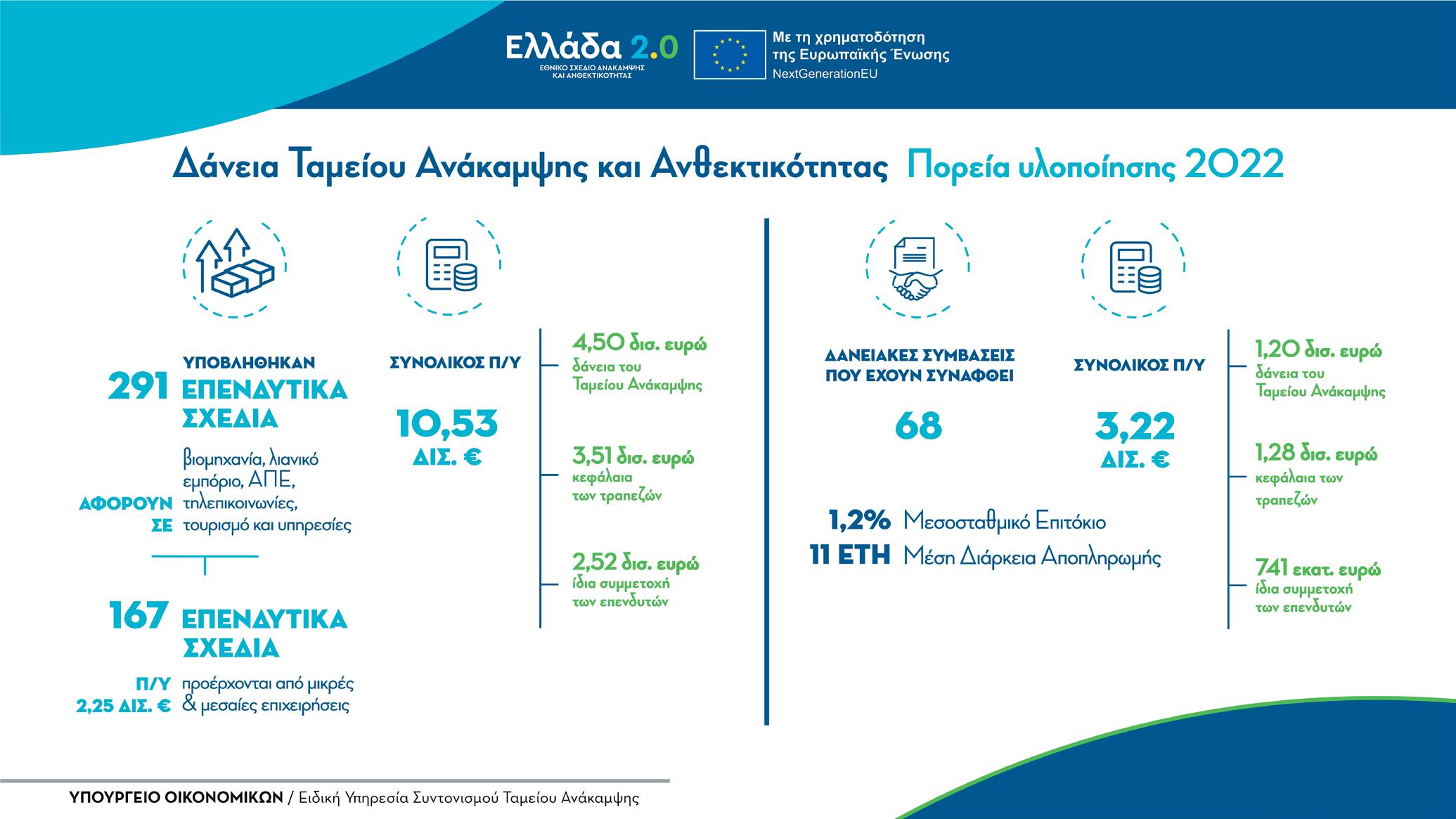 Σε 10,53 δισ. ευρώ ανέρχεται εξάλλου, ο συνολικός προϋπολογισμός των 291 επενδυτικών σχεδίων, που υποβλήθηκαν στο δανειακό σκέλος του Εθνικού Σχεδίου Ανάκαμψης και Ανθεκτικότητας «Ελλάδα 2.0», μέσα στο 2022. Από αυτά τα 10,53 δισ. ευρώ, 4,5 δισ. ευρώ αντιστοιχούν σε δάνεια του Ταμείου Ανάκαμψης και Ανθεκτικότητας (ΤΑΑ), 3,51 δισ. ευρώ σε κεφάλαια τραπεζών και 2,52 δισ. ευρώ σε ίδια συμμετοχή των επενδυτών.