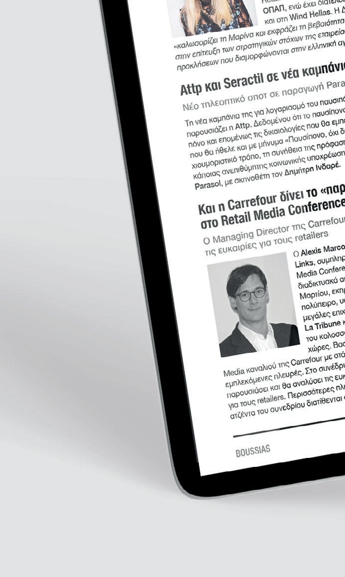 Διαφήμισης: Αγγέλα Κοντού, Τ: 210 6617 777 (εσωτ. 144), Ε: akontou@boussias.com