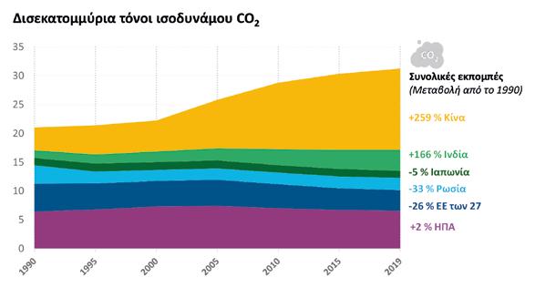 Πηγή: Για τις ΗΠΑ, την ΕΕ, την Ιαπωνία και τη Ρωσία: ΕΕΣ, βάσει της UNFCCC. Για την Ινδία και την Κίνα: PBL Netherlands Environmental Assessment Agency, έκθεση 2021