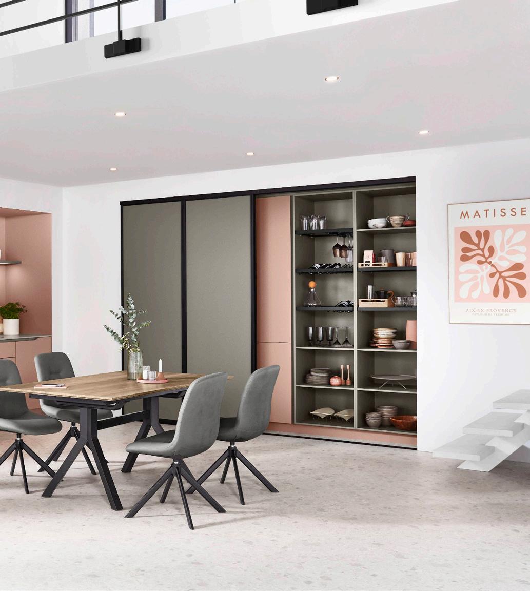 In keukenland zien we allerlei toevoegingen in kleur. Van leisteen grijs tot koraal roze, zoals deze keuken. De serie Zenas is nieuw in ons Sensum-assortiment en is uniek door het ultramatte lakfront. De Zenas-fronten scoren met verbeterde anti-vingerafdruk coating, ultrazacht aanvoelen, intensere kleurdiepte en unieke kleuren. Achter de schuifdeuren gaat een mooi systeem schuil (Taro interieurinrichting) om al je spullen netjes op te bergen. De schuifdeuren geven je de mogelijkheid om de rommel te verstoppen en een strak geheel te maken.