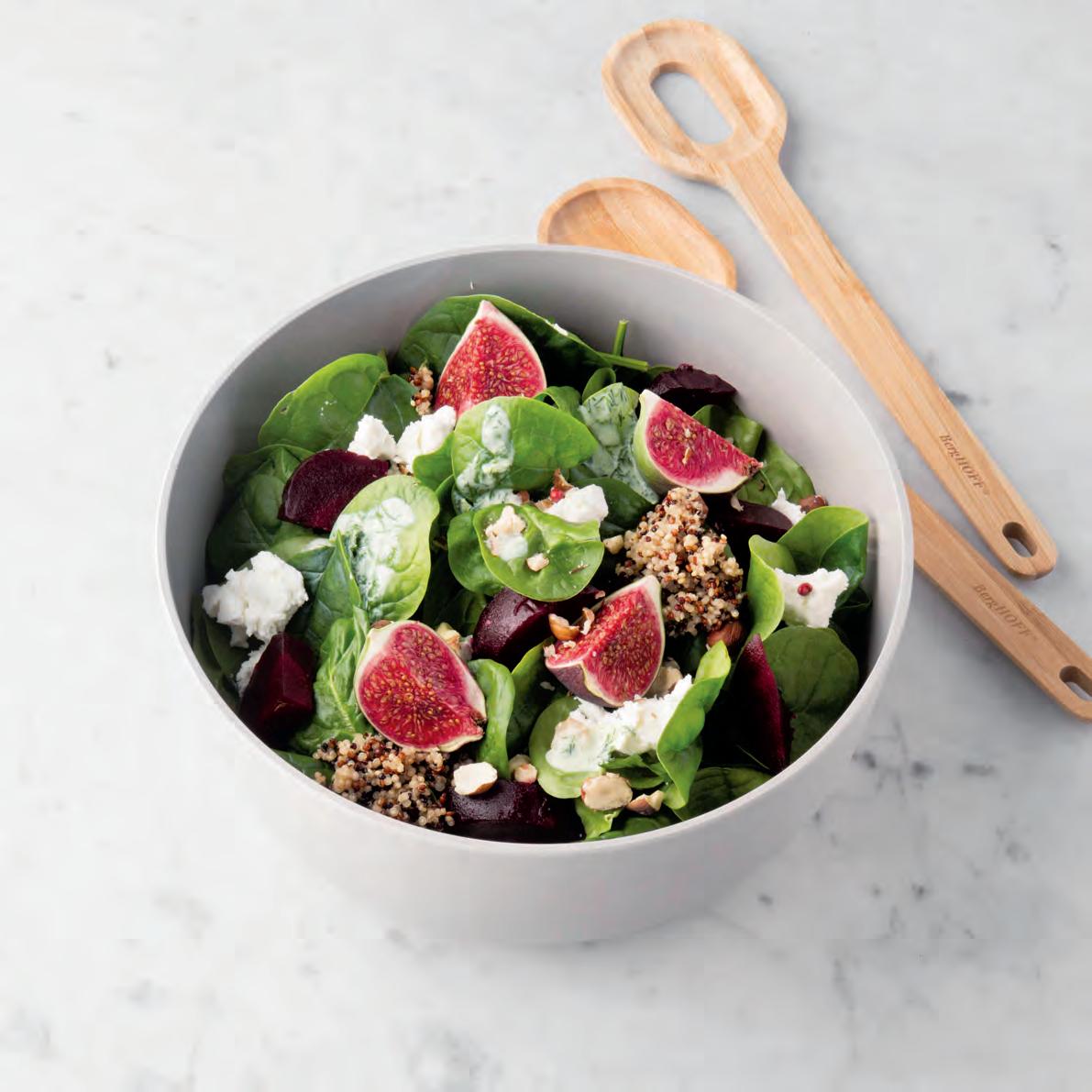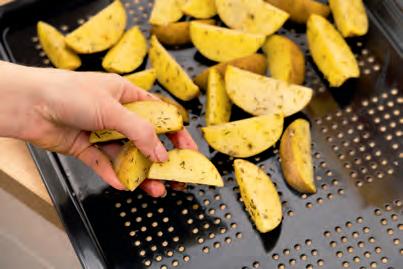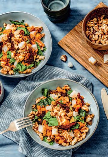 • Meng nu de spinazie, tomaatjes en geitenkaaasblokjes door de gestampte aardappelen. • Breng op smaak met een snuf peper en zout. • Verdeel over twee borden en maak af met wat gehakte walnoten on top.