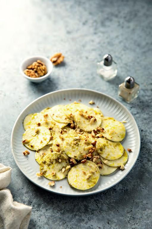 • 3 middelgrote courgettes • 2 el olijfolie • 1 el azijn • 2 kleine snufjes zout • 1 snufje peper • 1–2 teentjes knoflook • 2 el gehakte walnoten