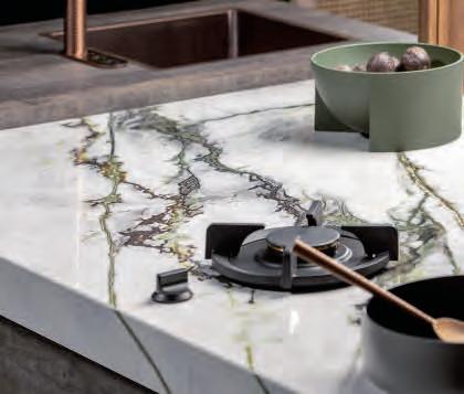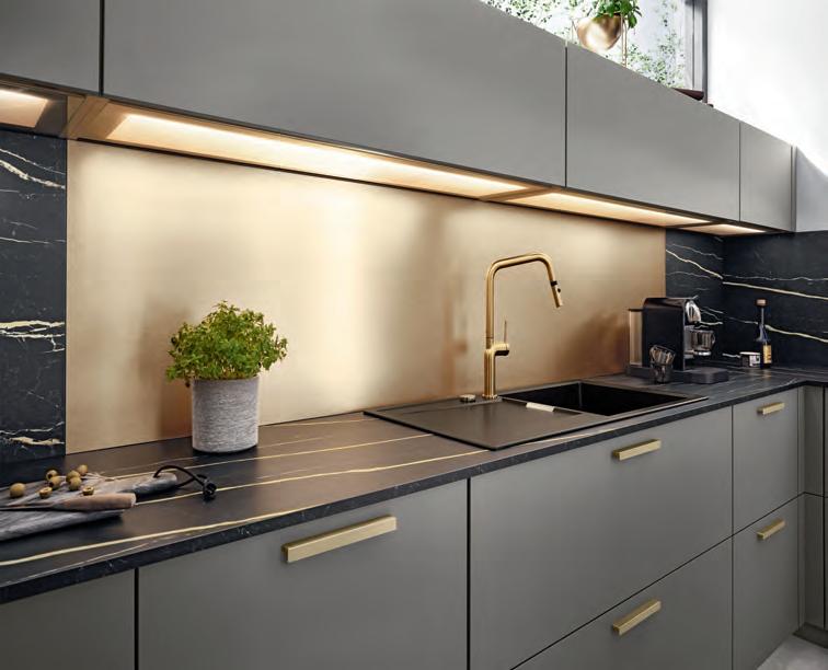 „Als het in de smaak valt, is het OK. Trendy nieuwe kleuren, gecombineerd met verfijnde accentenin dit geval een deftige goudkleur - en een natuurlijke marmerlook sluiten in deze keuken aan bij de huidige tijdgeest. Simpelweg heel chic!“