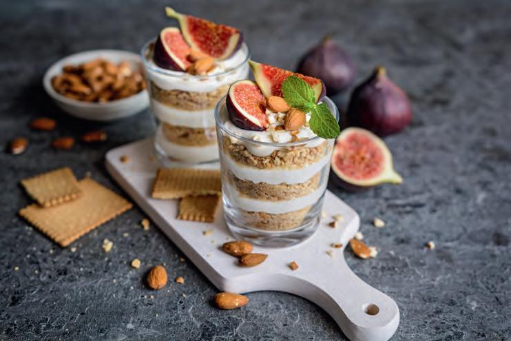 • Vul de glazen naar wens met afwisselend een laagje crème, een laagje koekmengsel en een laagje gehakte amandelen. • Zet het dessert minstens 2 uur in de koelkast. • Garneer elk glas voor het opdienen met kwartjes verse vijg, een paar hele amandelen en een blaadje munt.