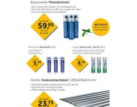 Wil jij altijd op de hoogte blijven van de scherpste acties en nieuws uit de bouwwereld? Dan kun je jouw hart ophalen met de Bouwcenter Folder en Actiemailing. Je profiteert namelijk altijd van de scherpste deals! Daarin staan maandelijks veel interessante aanbiedingen, deskundige informatie over de nieuwste producten, technieken en bijzondere services die wij je kunnen aanbieden.