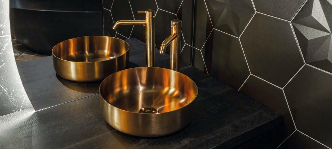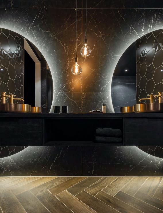 In deze opstelling speelt zwart de hoofdrol, aangevuld met matkoperen kranen en warme, donkere tegels. Grafische patronen en de natuurlijke uitstraling van marmer zorgen voor een stijlvol contrast.