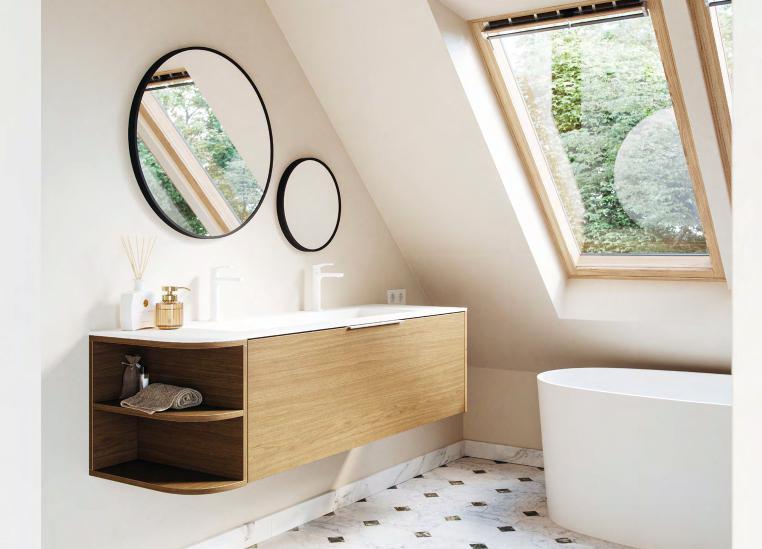 Speels, modern en organisch: het Primabad maatwerkprogramma is er nu ook met ronde vormen! Afgeronde HPL- of solid surface wastafelbladen, gecombineerd met open wastafelkasten, geven je badkamer een creatieve, speelse touch.