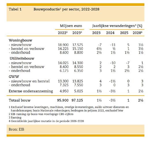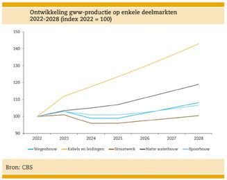 Door de energietransitie laten de werkzaamheden voor het leggen van kabels en leidingen een sterke groei zien, zowel voor de korte als de middellange termijn. Ook de natte waterbouw ontwikkelt zich gunstig door intensivering van de investeringen in waterkwaliteit en waterveiligheid. De werkzaamheden in de overige deelmarkten lopen op korte termijn terug, waarna op middellange termijn over de gehele linie herstel optreedt. De wegenbouw en activiteiten rond straatwerk en riolering ondervinden op korte termijn nog de negatieve invloed van de krimp in de woningbouw en stikstof. De totale bouwproductie bereikt in 2028 een volume van ruim € 102 miljard (prijzen 2022), hetgeen ruim € 5 miljard hoger is dan in het afgelopen jaar.