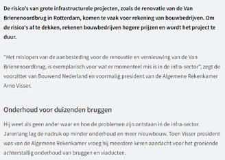 “We werken aan maatschappelijke vraagstukken zoals mobiliteit, klimaat en water en de energietransitie. Dat zijn belangrijke onderwerpen. Maar als er bezuinigingen nodig zijn, dan trekt onze sector nog te vaak aan het kortste eind. We willen de politiek en de maatschappij meer bewust maken van de noodzaak om ook nu in de infra te blijven investeren.”