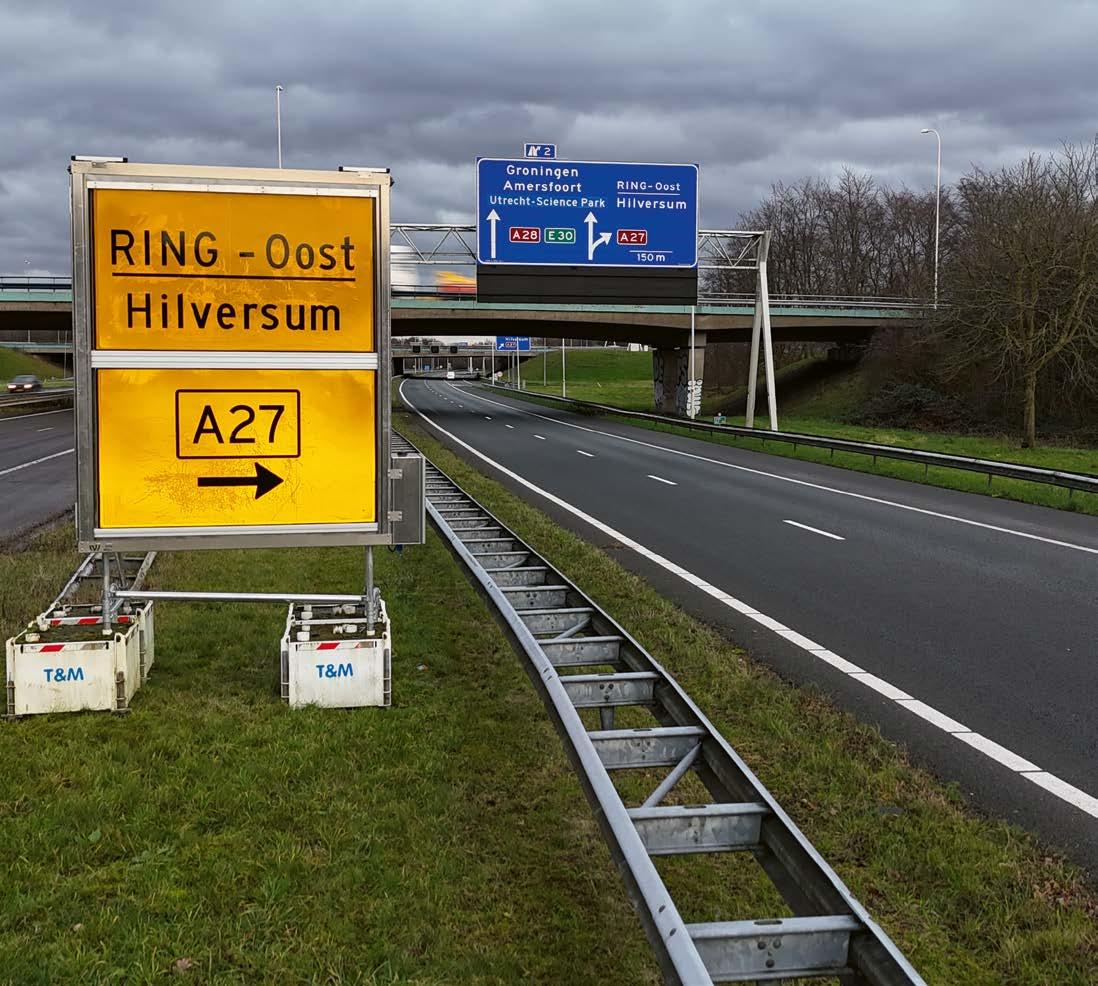 afgerond, dan drukken we op dezelfde knop en sluit het rolgordijn weer. En is het project helemaal klaar, dan sturen we een vrachtwagen met kraan om de borden uit de berm te takelen. Op de A27 wordt op dit moment de weg verbreed. Op dit traject dat pas in 2032 is afgerond, staan drie van onze Sign Screen-borden. Weekendafsluitingen worden al op deze nieuwe manier kenbaar gemaakt. Met een blik op de toekomst: we onderzoeken momenteel de mogelijkheden om onze Sign Screen-diensten aan bestaande navigatiediensten te koppelen.’ ●