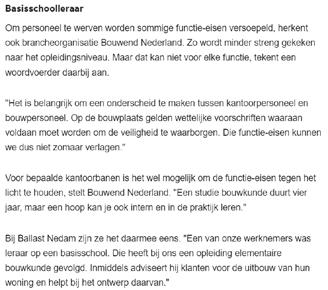 valt vroegtijdig af. ,,Het is lastig om vanuit een andere sector naar de bouw te gaan. Het werk is vaak zwaarder dan mensen denken. Je begint toch weer onderaan de ladder, je moet een opleiding naast je baan volgen en je komt in een heel nieuwe wereld terecht.’’ Van Rossem verwacht dat de tekorten de komende vijf jaar nog verder stijgen. ,,We willen als organisatie meer aandacht besteden aan het omscholingsproces om te voorkomen dat veel mensen uitvallen. Ook moeten we de bouw aantrekkelijker maken voor groepen die tot nu ondervertegenwoordigd zijn, zoals vrouwen. Daarnaast moeten we statushouders die in de bouw willen werken, helpen om sneller aan de slag te kunnen.’’