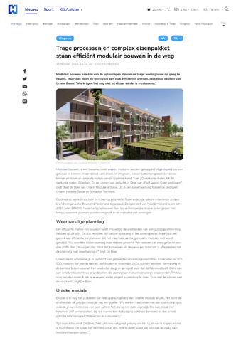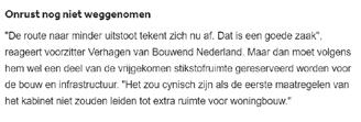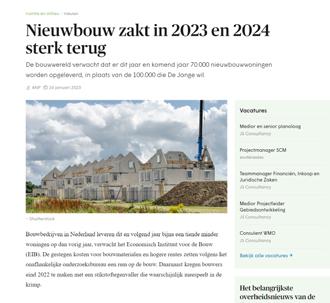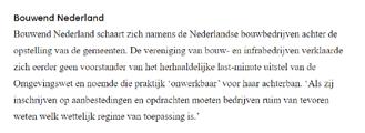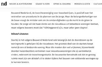 9 december 10 februari 21 februari BNL IN DE MEDIA DEC 2022/ FEB 2023 25 februari 17 februari 15 februari 10 februari x(7B0EA4*KKKOSO( +\!z!.!$!% re�d�a�c�t�i�e�@�n�rc�.�n�l n�rc�.�n�l�/ove�ro�n�s ga�voor�meer�informatie n�rc�.�n�l�/s�e�r�v�i�c�e 4,20 Jaargang�53 Deze�uitgave�komt�voort�uit Algemeen�Handelsblad�(1828) Courant�(1844) De�hele�dag�op�de�hoogte n�rc�.�n�l�/n�i�e�u�w�s�b�r�i�eve�n�/a�c�t�u�e�e�l 1928�-2�02�3 Burt Bacharach schreef liedjes met sterke melodieën, in een gracieuze stijl IN�HET�NIEUWS�1�2-1�3 Integriteit VVD is ondanks beloften niet erg voor varend IN�HET�NIEUWS� 100.000 woningen fors vertraagd ST�I�K�STO�FC�R�I�S�I�S Door�onze�redacteuren Martin�Kuiper Sjoerd�Klumpenaar Debouw vanbijna honderdduizend woningenloopt door het wegvallen van de bouwvrijte ng forse vertraging op. Dit blijkt uit onderzoek van het Economisch Instituut voor de Bouw (EIB) in opdracht vanbranchevereniging Bouwend Nederland. Debouw van zeker niet doorgaan. Beginnovember vorigjaarhaalde deRaadvanState eenstreepdoorde bouwvrijstelling.Die maaktehettot dan toemogelijk om doorte bouwen tijdens destikstofcrisis, doordatde stikstofuitstoot vanbouwbedrijven niet werd meegeteld in de vergunning. Nederland negeerdezo Europese wetgeving,maar datmag niet langer.Bouwbedrijven moetensinds de uitspraakvoor elkbouwproject stikstofberekeningen maken. Het EIB-onderzoek laat zien wat de impactvan hetvonnisvan deRaad vanStateis opdebouwopgavevan Het schrappen van de bouwvrijstelling leidt tot extra kosten en onderzoeken. Dat zorgt voor minstens maanden vertraging. minister Hugode Jonge(Volkshuisvesting enRuimtelijke Ordening, CDA).DeJonge heeftbeloofdtoten met 2030 ruim 900.000 woningen te bouwen. Die belofte was al ambitieus, maar lijkt inmiddels steeds onrealistischer nu ook debouwkosten zijn gestegen en woningprijzendalen door de stijgende rente. een enquête afgenomenonder 460 bouwbedrijven,waaronder ookde grotere bouwbedrijvendie actiefzijn in grootschalige woningbouw. Voor al hun projecten moet zij laten zien wat de uitstoot is van hun bouwmachines meteen zogenaamdeAerius-berekeningen aantonendatze geenschadeaan denatuurberokkenen. Ditzorgt op kortetermijn voor ieder bouwprojectvoor tweemaanden vertraging.Volgens hetEIB-onderzoek is dit niet proportioneel, omdat in veel gevallen wordt vastgesteld datde natuurgeen schadeoploopt door het bouwproject. Alsnatuurschade nietvolledigkan wordenuitgesloten, moeteraanvullend een ecologisch onderzoek en een bijbehorende natuurvergunning komen. Datgeldt volgenshet EIBvoor de bouw van een op de tien woningen. onderzoeken zijn omvangrijker aldus het EIB, en hebben een langere do o p d .Ze kostennogeens zestot negenmaandenen debouwer HetEIB iservanuitgegaandat ervoldoende capaciteit is bij bureaus die berekeningen uitvoeren, terwijl er een tekort isaan deskundigenvoor ecologischonderzoek. Ookbij degemeen– die de rapportagecontroleren –zijn grote capaciteitsproblemen. Van behoedzame schatting .Van Hoek: Er is inderdaad een risico op nog meer vertraging. Bovendien, zegt oep Rats, directeur Beleid en Vereniging bij Bouwend Nederland, liggen er momenteel ook een groot aantal infrastructurele projectenstil dooreen ge-derzoek vreest op korte termijn voor verdere vertragingdoor nieuwe uitspraken van de Raad van State. Hoge kosten bouwbedrijven Voorbouwers enprojectontwikkelaars ishet schrappenvan debouwvrijstelling een financiëlestrop, zo blijkt uit hetonderzoek. De bouwvertraging kost de sectorde komende vijf jaar zo n340 miljoeneuro,berekende het EIB. Alleen aldit jaar maakt de n 100 miljoen euro aan extra kosten.Dit gaatvooral naaraanvullendonderzoek voorereen schopin de grondmag. Grootstekostenpost: gelddatgeïnvesteerd wordtinbouwprojecten die helemaal niet doorgaan. Debouw vanzekerachtduizend woningen zal de komende jaren naar verwachting niet doorgaan, omdat ze niet aande wettelijkeeisen voldoen,ruimte inde buurt is. Omte kunnen bouwen is er stikstofruimte nodig, die kan worden gekocht van bijvoorbeeld stoppende boeren.Naast gemeenten zijn er ook andere partijen die interesse hebben in stikstofruimte. Zo kochtenSchiphol enFrieslandCampina recent uitstootrechtenvan boeen op voor hun eigen vergunning. Debouw kanzelf ookmaatregelen nemenzodat eenbouwprojecttoch kan doorgaan, doormet elektrisch bouwmaterieel zoals busjes, trilapparaten en graafmachines te werken. Dit helpt omkleine overschrijdingenvan de norm terug tedringen, maar volgens het EIB duurt het nog jaren voordat bouwers zo ver zijn. Als het aan de bouwbranche ligt, komter een einde aan de verplichting om voor elk bouwproject een stikstofberekening tedoen. MinisterDeJongeliet ineen commissiedebat donderdagweten dat er gewerkt wordtaan eenzeggen hoelang dit nog duurt. Ve�r�k�i�e�z�i�n�g�e�n De SPD dreigt Berlijn na 21 jaar te verliezen IN�HET�NIEUWS�14�-1�5 L�i�t�e�ra�t�u�u�r Het genre van de biografie mag sprankelender BOEKEN�C�6�-7 De bouwvertraging kost de sector de komende vijf jaar n 340 miljoen euro A�a�r�d�b�ev�i�n�g�e�n Syrië�&�Turkije Hu porganisaties zien liever geld IN�HET�NIEUWS� Aardbevingen volgden een zorgwekkend patroon IN�HET�NIEUWS� In Syrië komt de steun bewust traag op gang IN�HET�NIEUWS� Turkse dorpjes als Sekeroba wachten nog op noodhulp IN�HET�NIEUWS�6�-7 FOTO�AFP 10 februari 6 februari 26 januari 26 januari 15 december donderdag 15 december 2022 NL