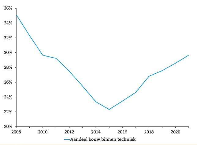 Daarnaast valt het aantal instromers in de bouw tegen. Mensen willen zich wel laten omscholen, maar de helft van hen
