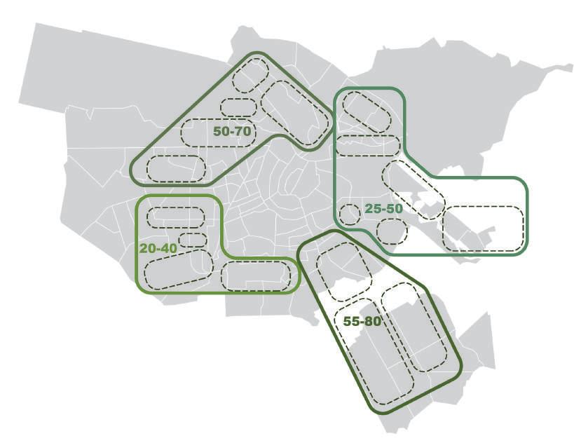 ‘Groen’ betekent in dit ontwerpend onderzoek een buitenruimte dat niet versteend is en bestaat uit levende beplanting. Kunstgras is geen groene ruimte.