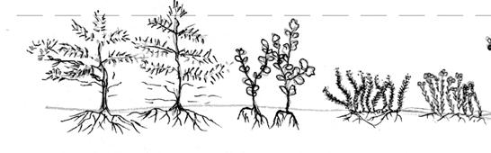 The sections illustrate from left to right the tree, shrub and grass layers respectively.