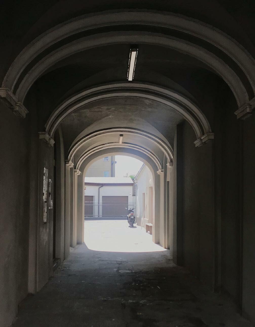 There are 16 entrances to the inner world of the urban block from the main building, which is 300 meters long. In order to make it easier for visitors to find their way around, I have decided to assign a different floor pattern for each entrance.