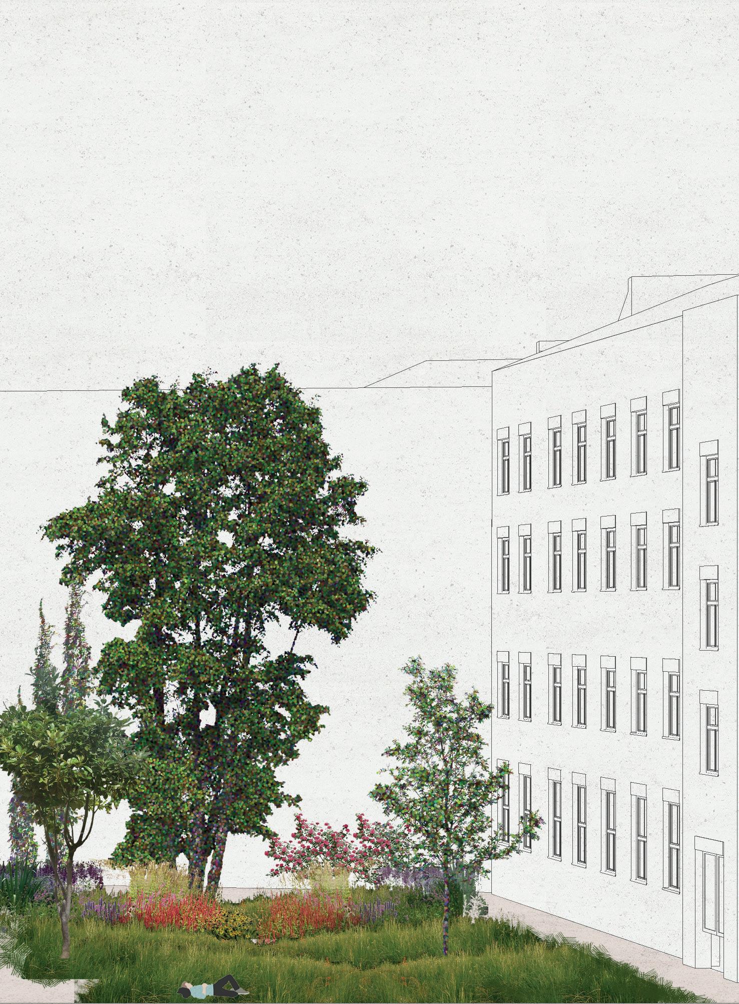 My project draws on this tradition, tenement houses do not exist without courtyards and I want to bring them back to their former glory by making them green and liveable again. Some of them are used for the productive purposes - cultivating plants (part of the vocational school) and some for recreational purposes serving inhabitants and the whole neighbourhood.