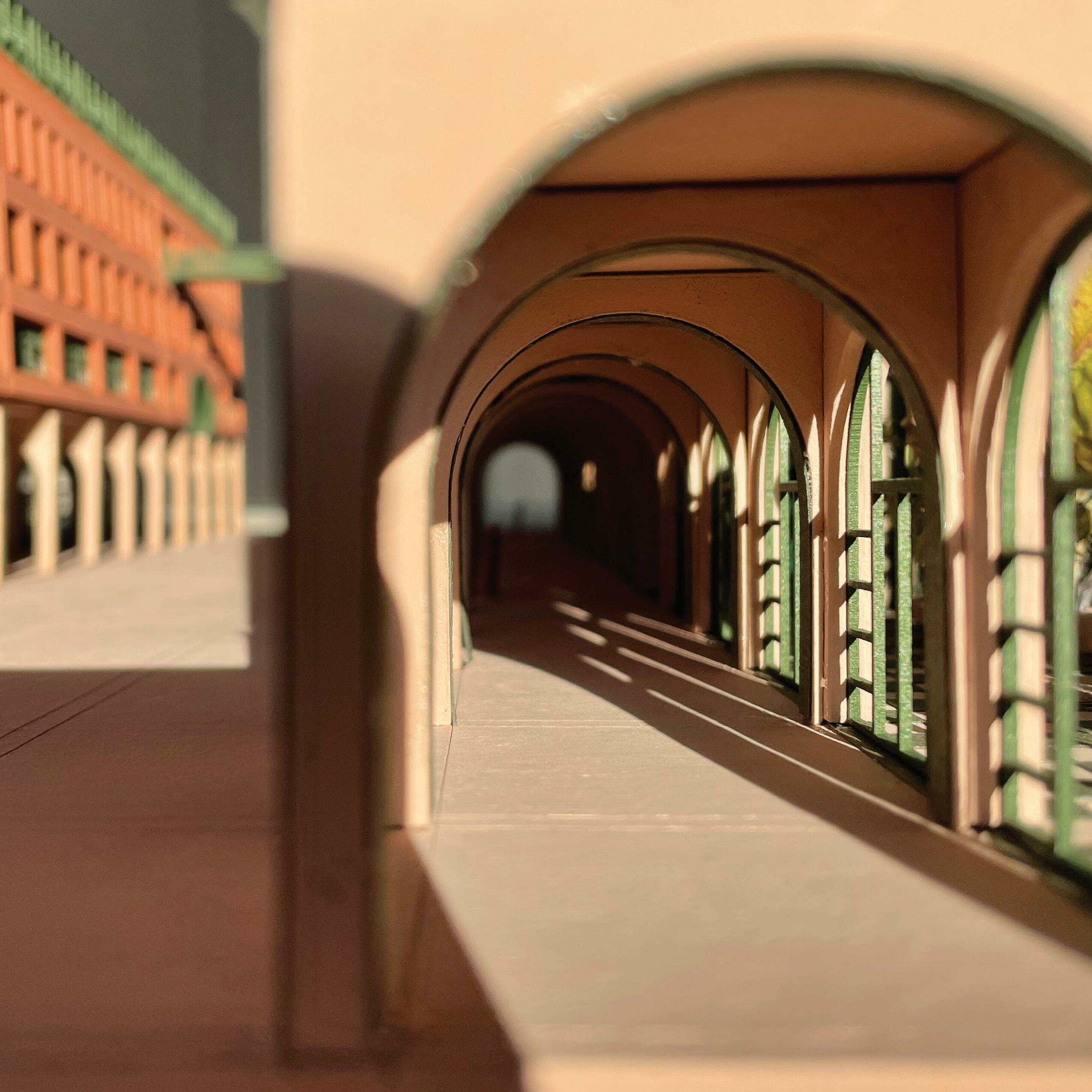 The main facade facing the street was historically housing the most important functions and was also the richest in its decorations, while the side facing the courtyard is much more modest and practical, with very little decoration. I have applied a similar principle to my design, where the facade of the building facing the central street is covered with plaster, while the internal facades facing the courtyard continues the walls of the existing buildings, which are made of brick.