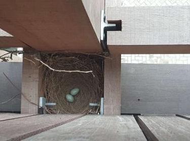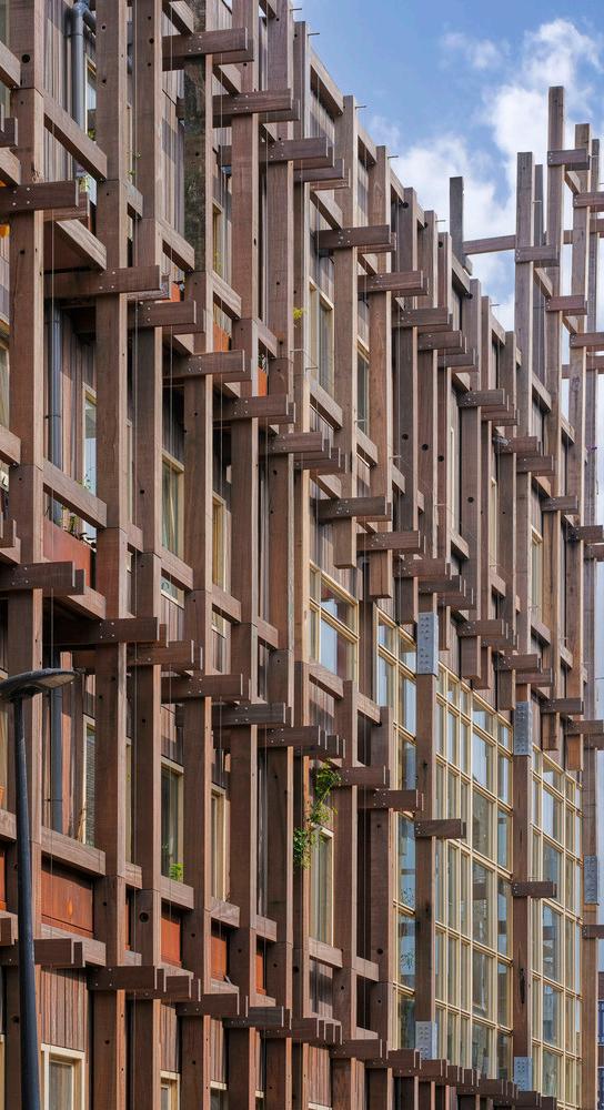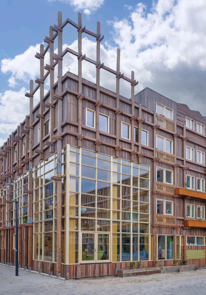 The 'mikado' aspect combined with the different types of wood remind of the nest of birds. In addition, the thickness of the facades allows to create balconies and has a nature inclusive approach (with planters that use rainwater water from the polder roof). The façades are real living spaces.