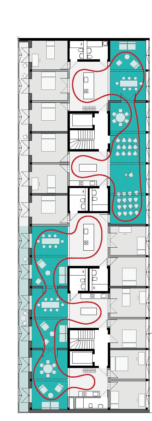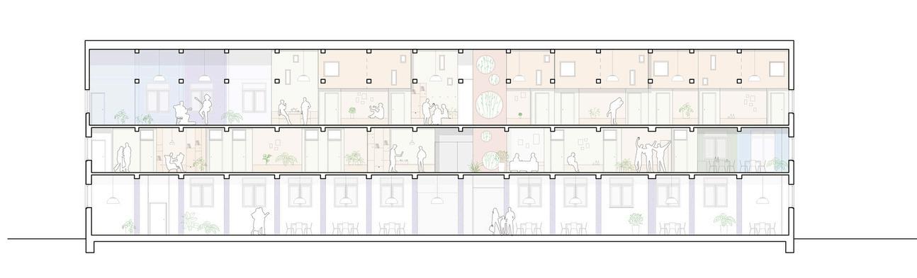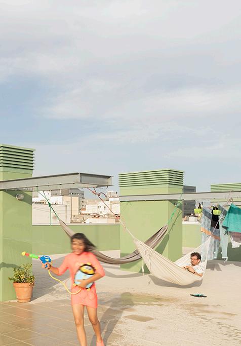 The building has 25% of his whole area dedicated to common spaces : a communal kitchen of 80m2 where large meals can be organised, 100m2 a multipurpose covered space, two guest rooms, a laundry room, a large central circulation space, bicycle parking, and outdoor terraces.