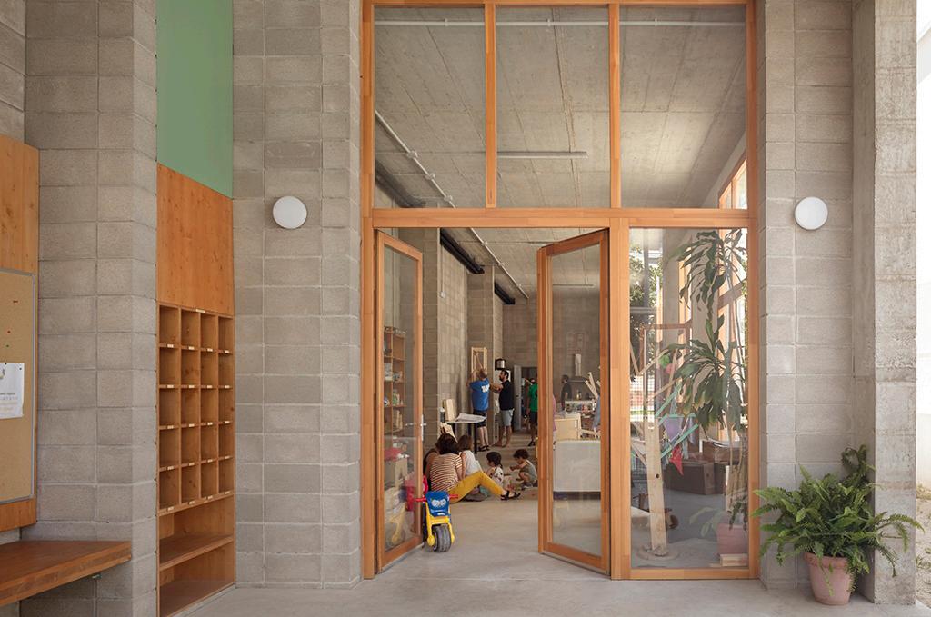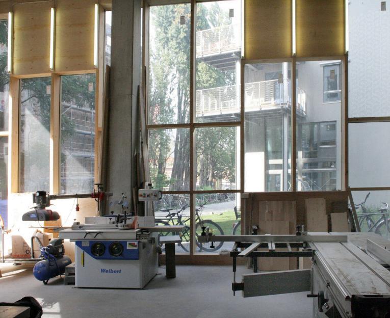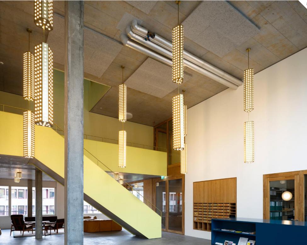 The ground floor is largely open to the public space, reflecting its attitude to the urban environment. It includes various facilities, including some dedicated to work : studios, co-working spaces and a carpentry workshop.
