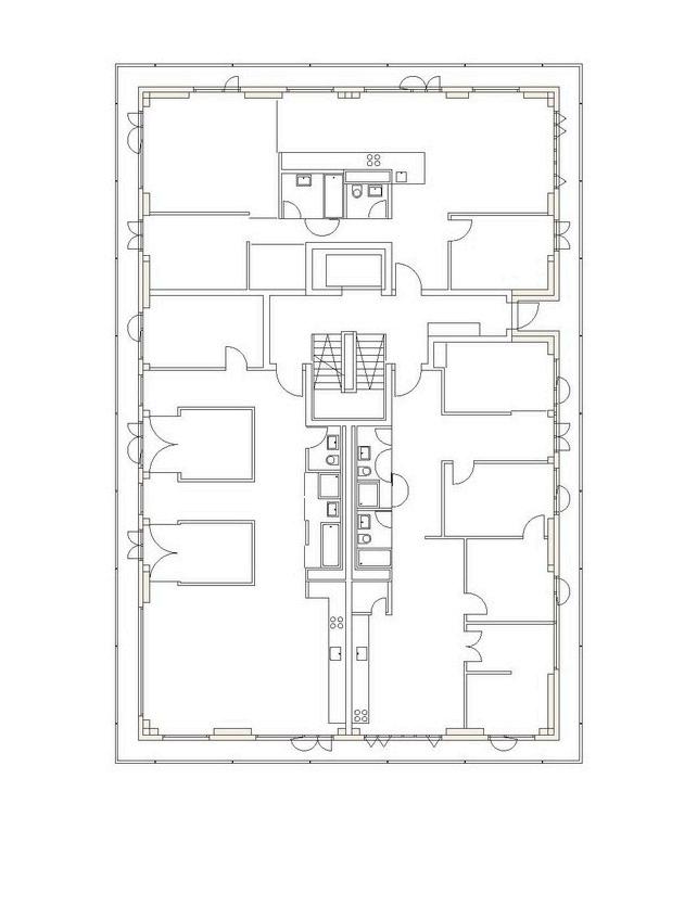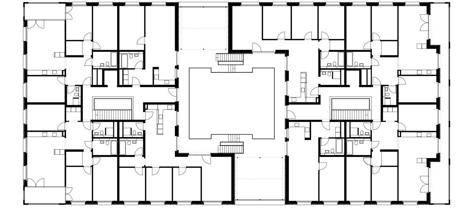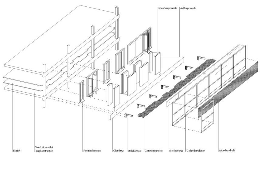 The volume is a rectangle of four-storeys following the regular forms of the former military compound. The architect Sauerbruch explains that all the members had the common "desire for maximum flexibility and freedom in the division and use of the spaces, also in the long term”. Therefore, the architecture office proposed a building entirely free of columns where the technical shafts are within the depth of the façades. Each apartment enjoys double orientation (North & South).