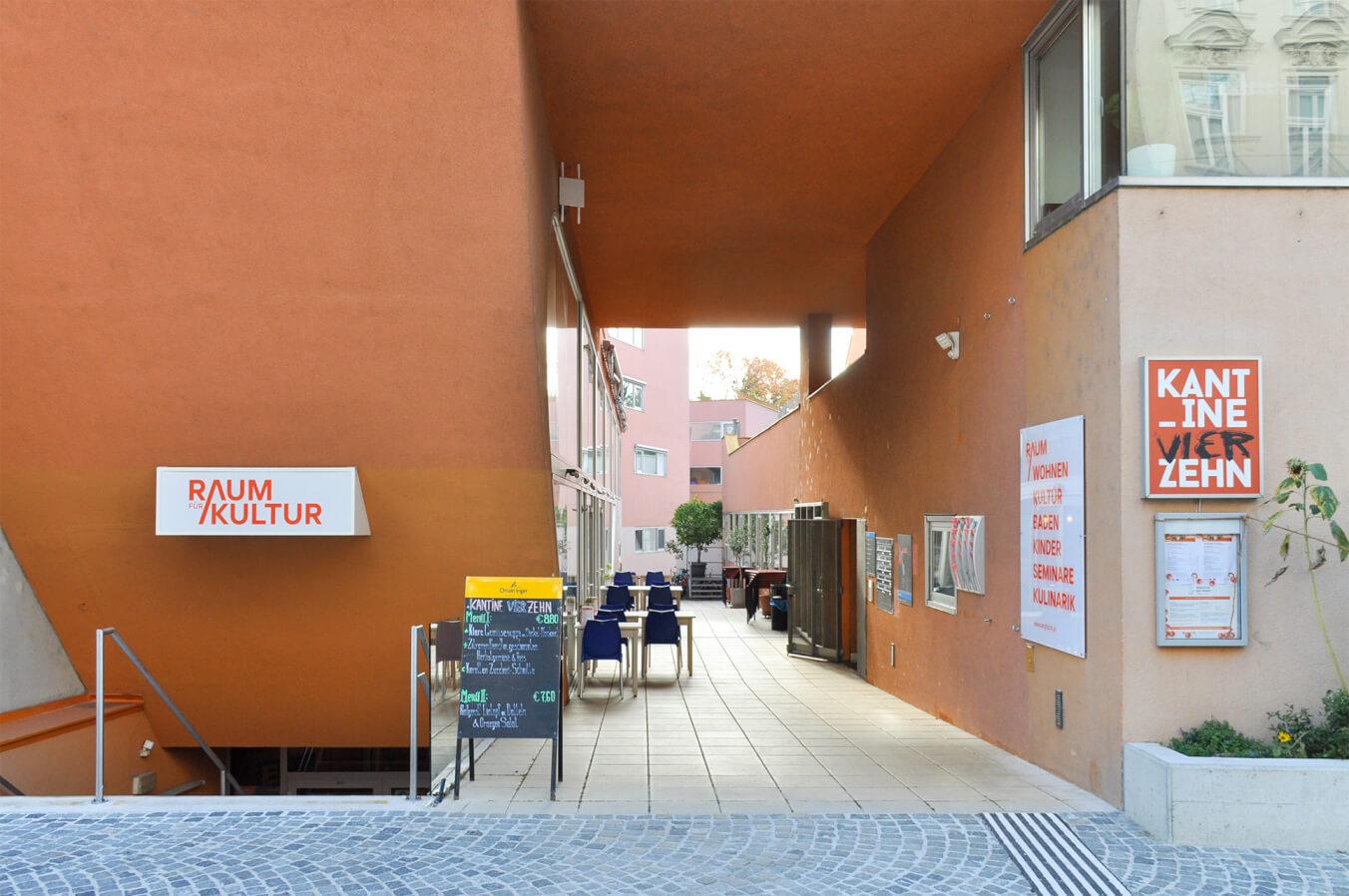 On the ground floor, the café-restaurant Die Kant_ine vier zehn is a popular meeting place for the residents and for the neighborhood. It is open before and after cultural events, seminars and for lunch.