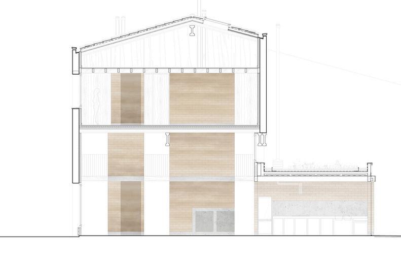 In regards to the existing building (warehouse), the scale of the project and the expectations, a central core of three high-rise volumes articulates the whole new organisation. The nucleus is made of walls of compacted earth blocks (CEB). It generates spaces for circulations, storages, facilities and installations: fireplace, stairs, bathrooms, kitchen, laundry, or machine room.