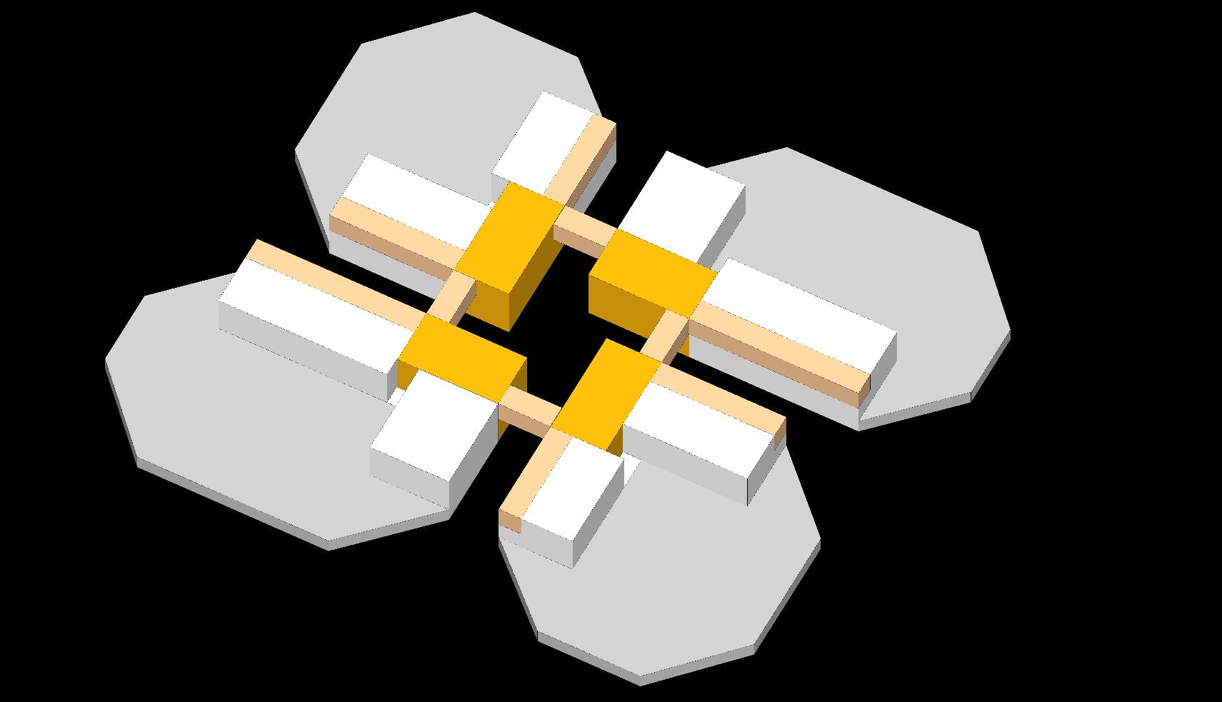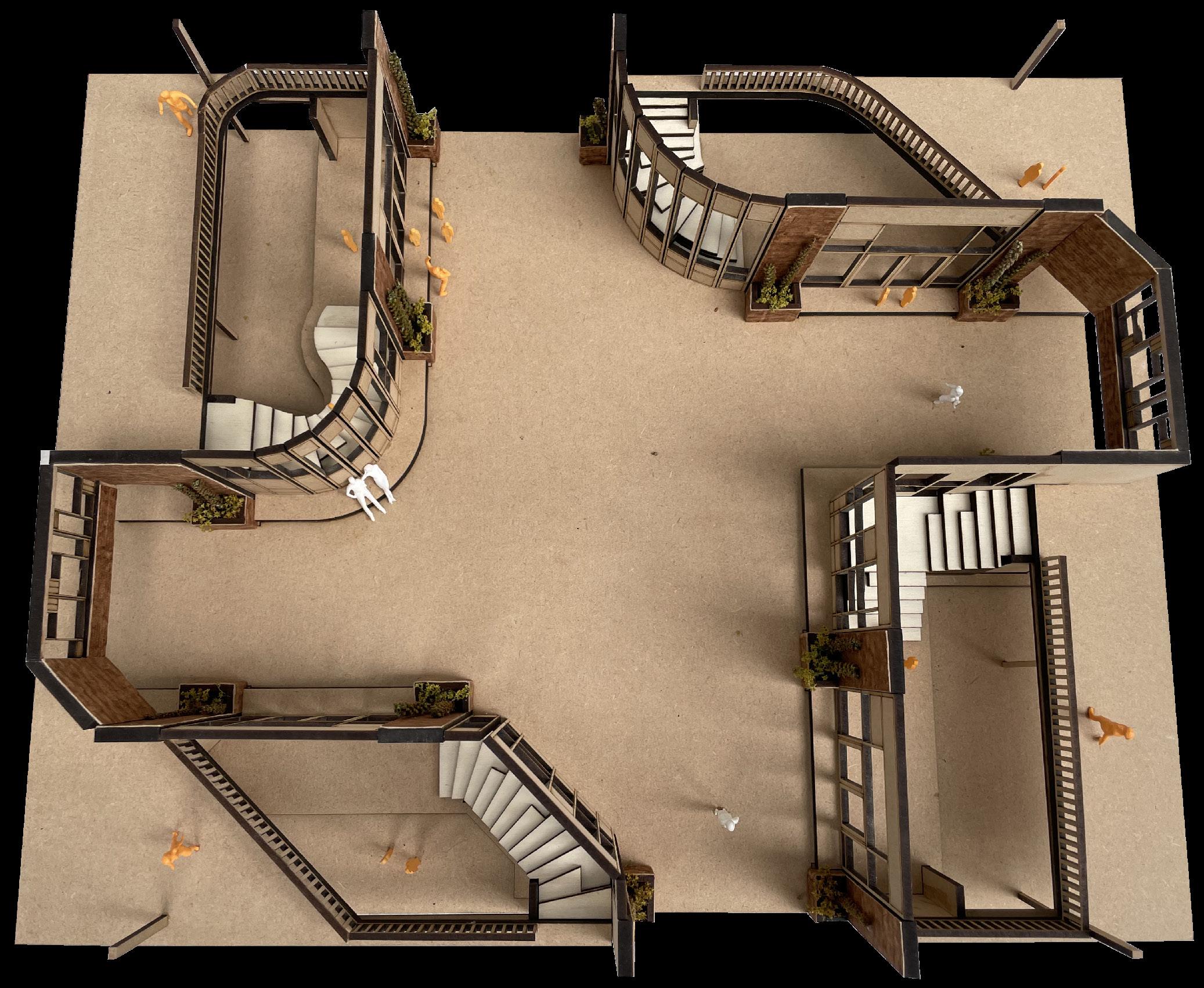 Op de plek waar de twee stegen elkaar kruisen ontstaat het centrale plein van het plan. Dit plein is groot genoeg om school of wijkevenementen te houden. Er is hier voor gekozen om een flexibel element te ontwerpen die zich aan het evenement aanpast. Denk hierbij aan een podia voor een theater of een bar voor een straatfeest. Hiervoor worden dan ook in de straat voorzieningen getroffen.