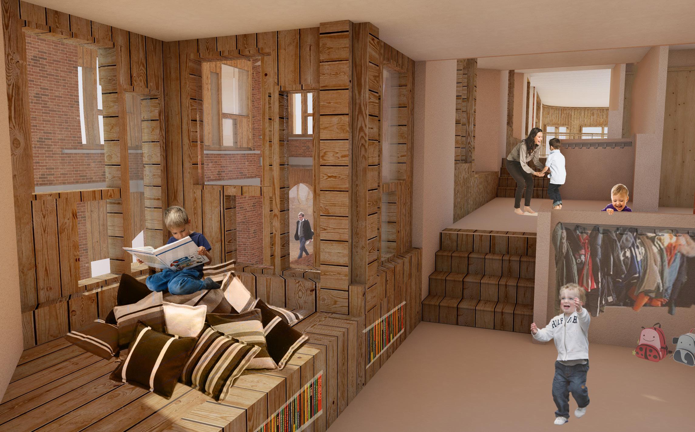 Zoals eerder beschreven staat Zundert bekend als één van de grootste boomkwekerscentra van Europa. Dagelijks worden hier kleine tot middelgrote bomen geëxporteerd om uit te groeien tot volwassen bomen. In het interieur wil ik dit lokaal gekweekte materiaal terug laten komen. De houten elementen zijn goed voor de gezondheid, hebben een heerlijke geur en zijn duurzaam. De elementen waar de kinderen gebruik van maken zoals: vensterbanken, raamkozijnen, verhogingen en nissen worden ook in hout uitgevoerd om de interactie met een natuurlijk materiaal te stimuleren.