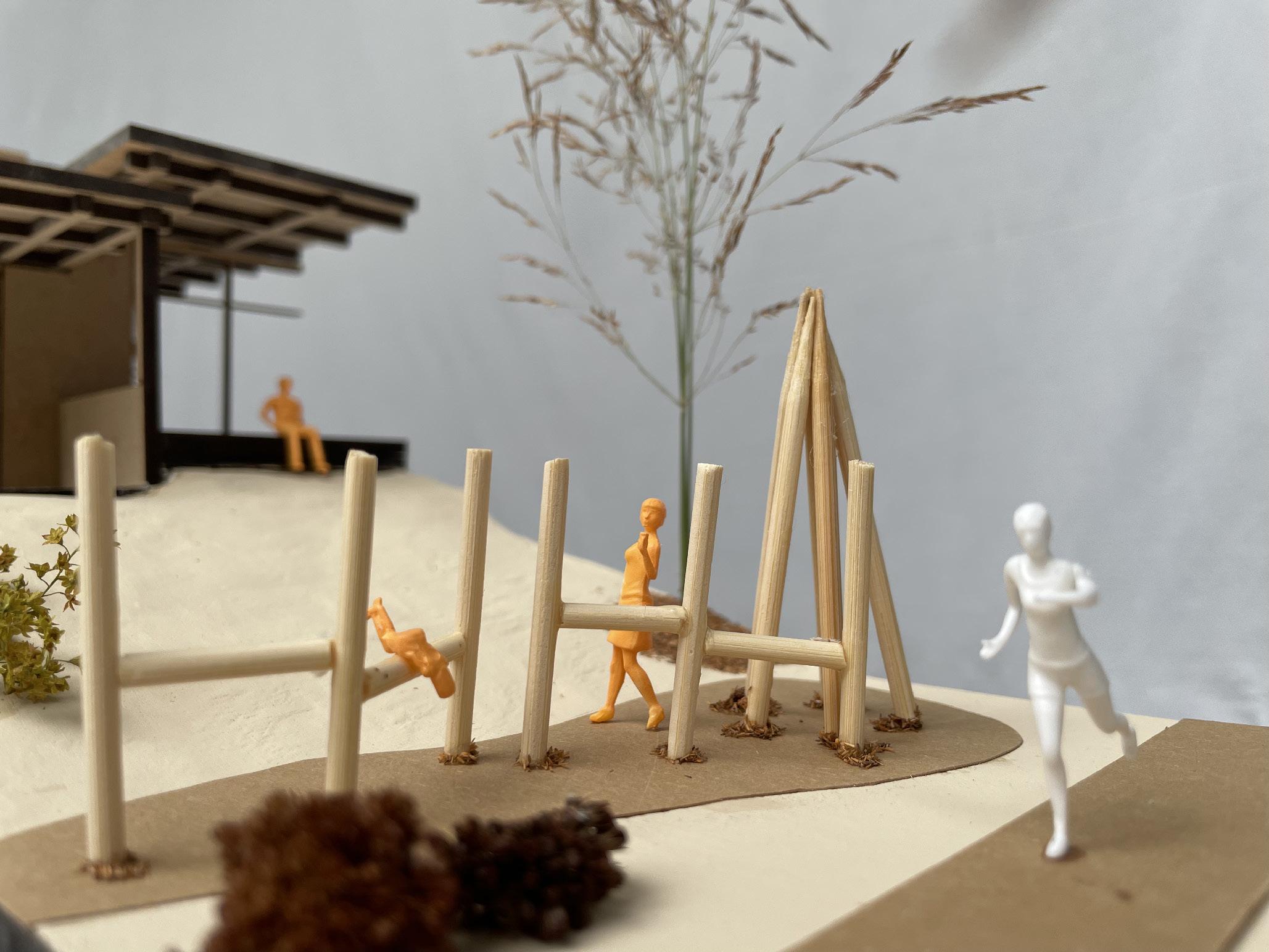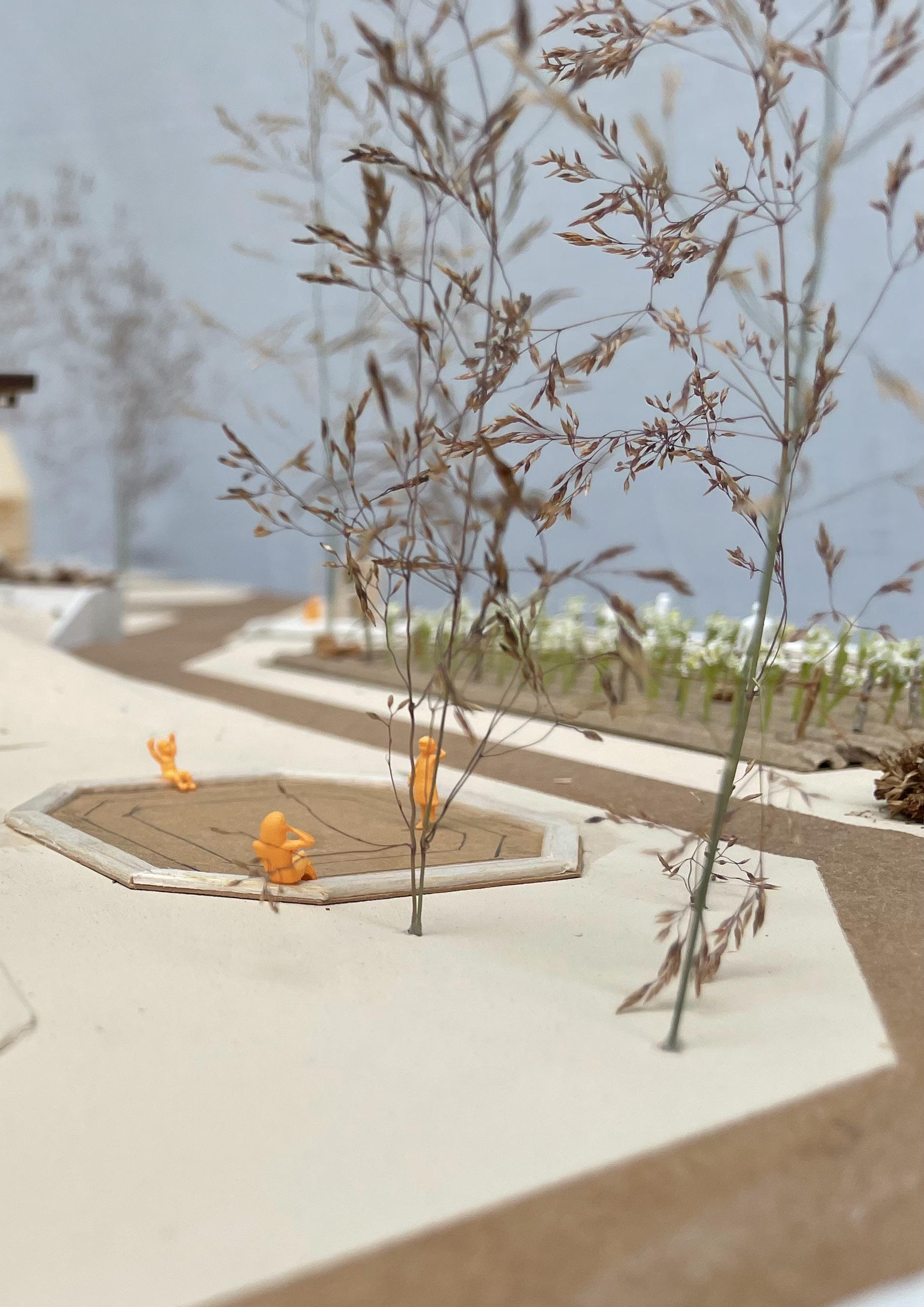 Door het landschap aan de achtergevel (de buitenzijde) op te hogen creëer je een natuurlijke landschappelijke begeleiding naar de centrale assen door het gebouw. De opgetrokken landschappen zijn publiekelijk toegankelijk, maar gaan door middel van sociale controle een passieve rol spelen in het ontwerp. Door het verhoogde talud ontstaat er een gebied dat in de invloedssferen van de school staat. Dit houd in dat de bezoekers van het talud een trap op gaan en zich als het ware in een publieke binnentuin begeven waar de kinderen van de school spelen en tegelijkertijd de hond uitgelaten kan worden.