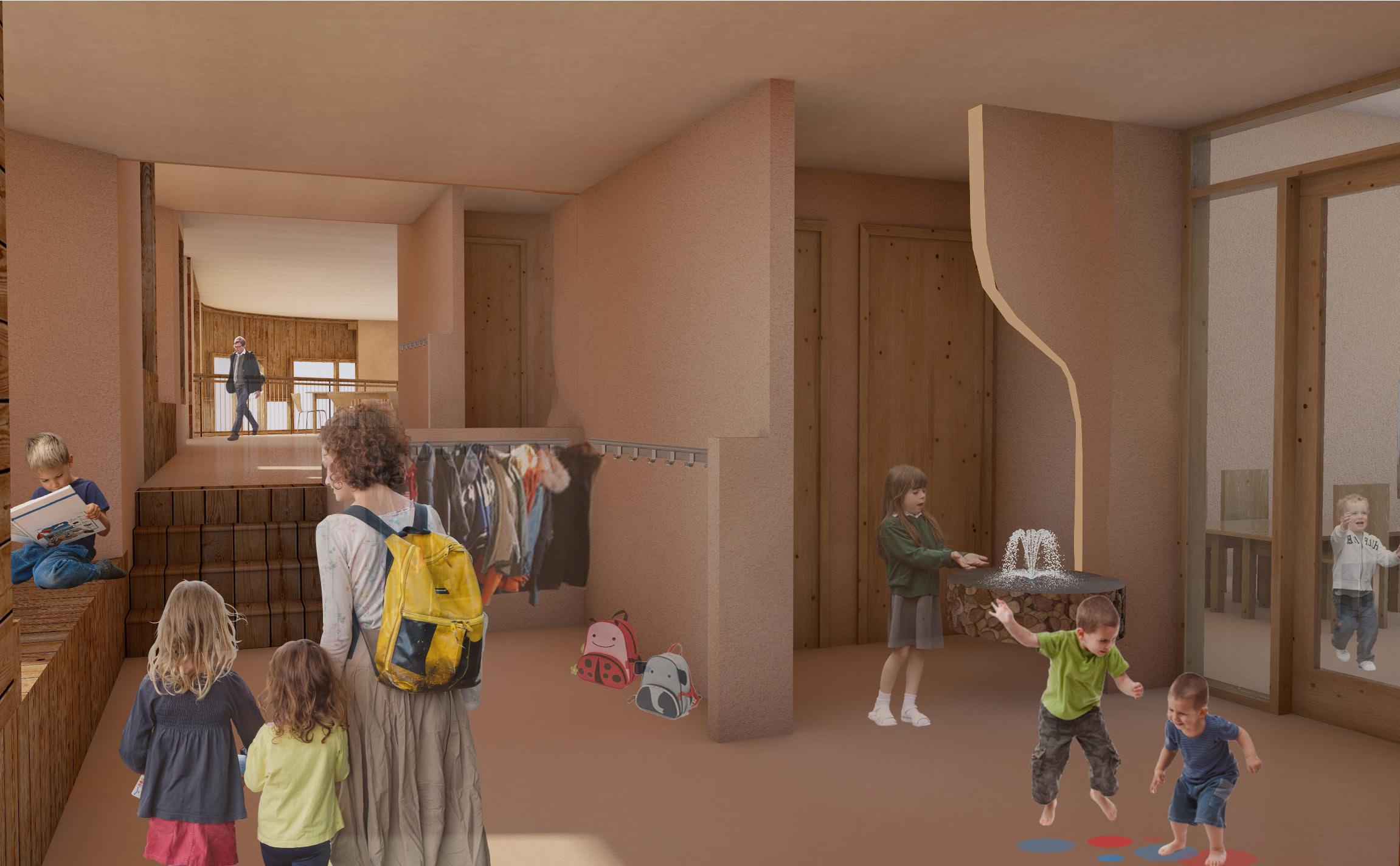 In dit project word gebruik gemaakt van hernieuwbare materialen zoals hout, steen en beton. Naast de estetische kwaliteiten, bezitten deze materialen ook de gewenste thermische en constructieve kwaliteiten. De tactiele kwaliteit van de toegepaste materialen komen terug in de dagelijkse lessen van de kinderen die in de ateliers worden uitgevoerd. Het zorgt ervoor dat ze in verbinding staan met de natuur, hun cognitieve vermogens ontwikkeld en op lange termijn het gebouw gaan begrijpen.