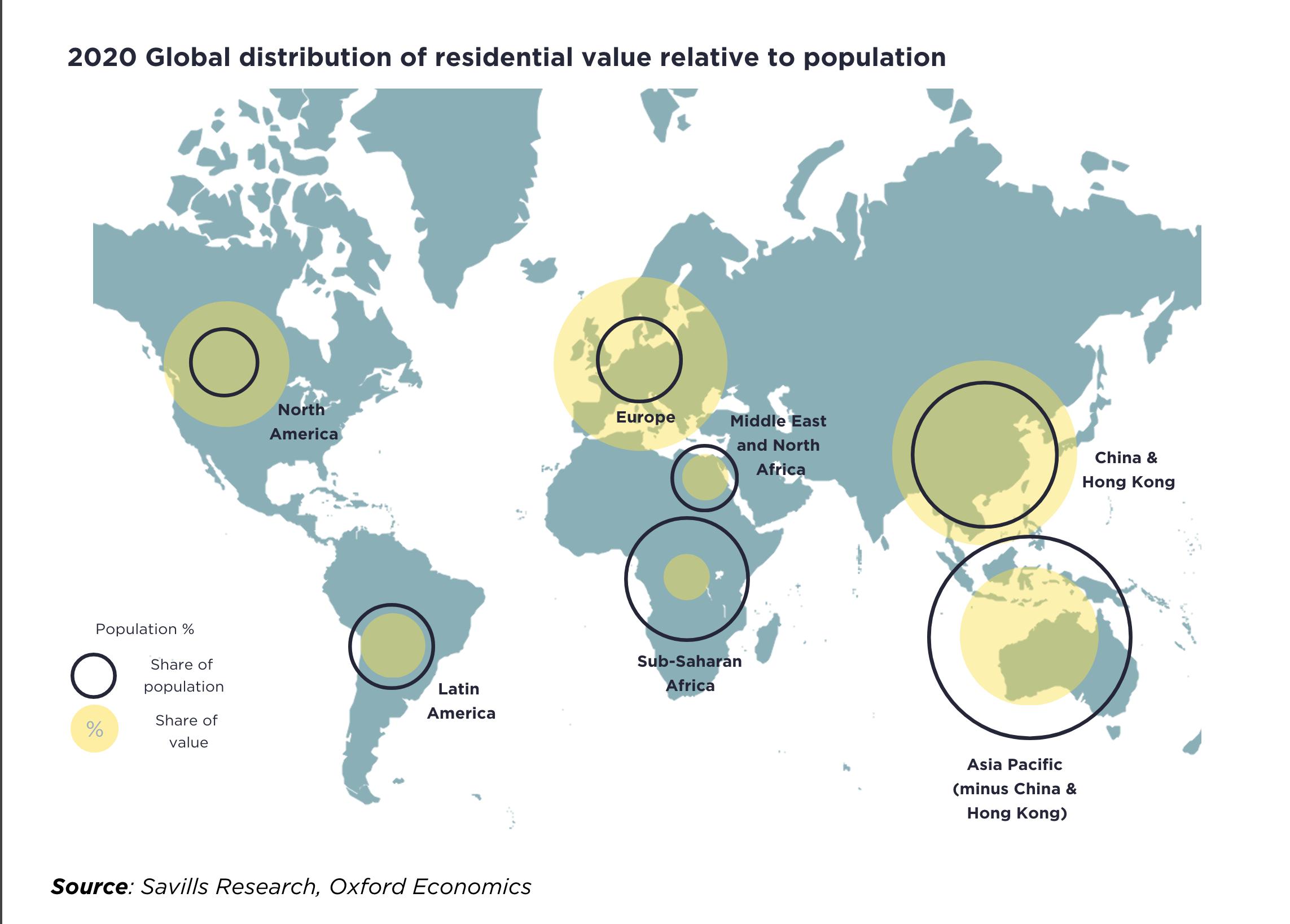 A disproportional amount of residential wealth is concentrated in Europe, along with North America. Accounting for 43% of value despite being home to just 17% of the world population. In the wake of a low interest rate environment a lot of capital is looking for a both appreciation and income.