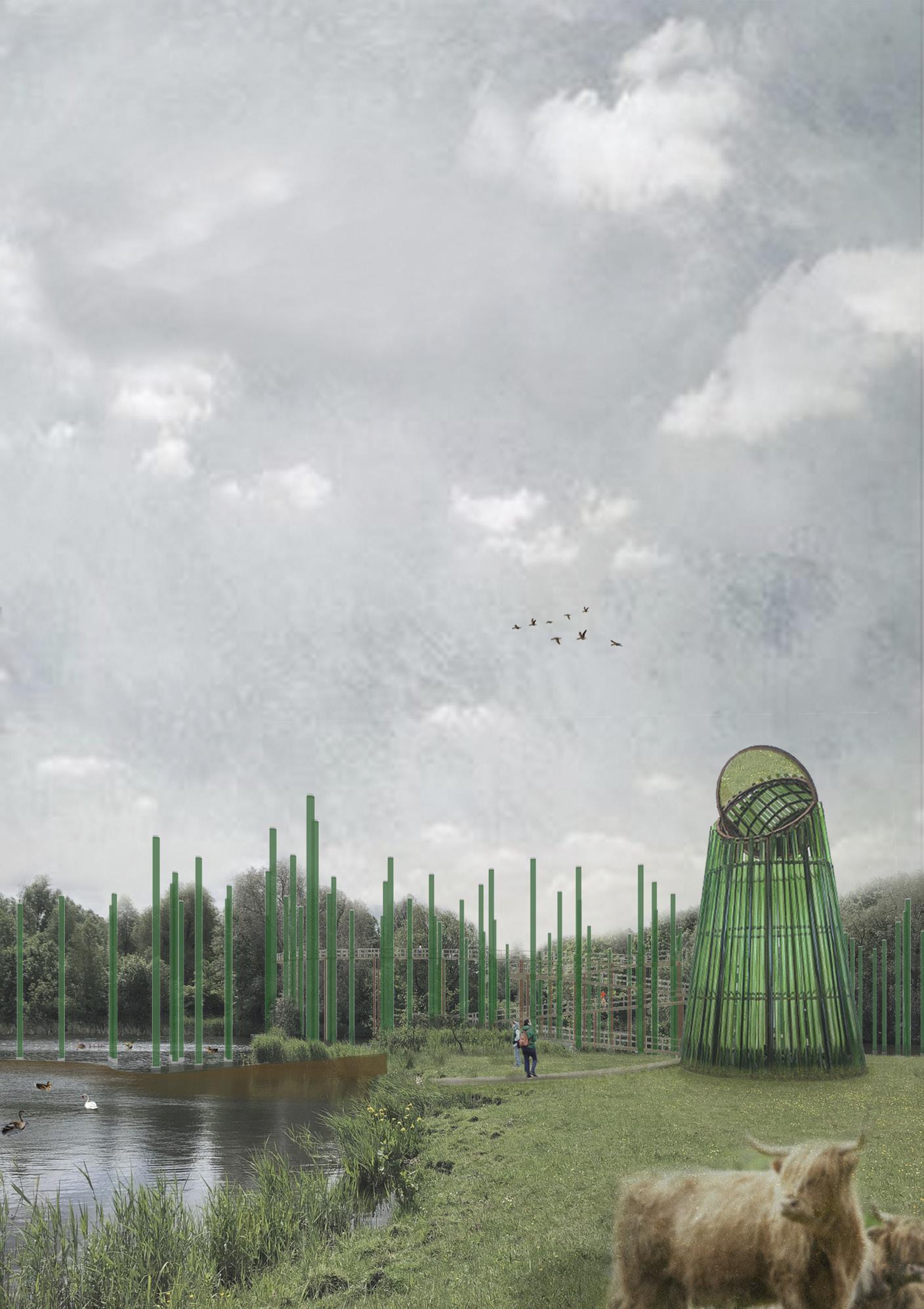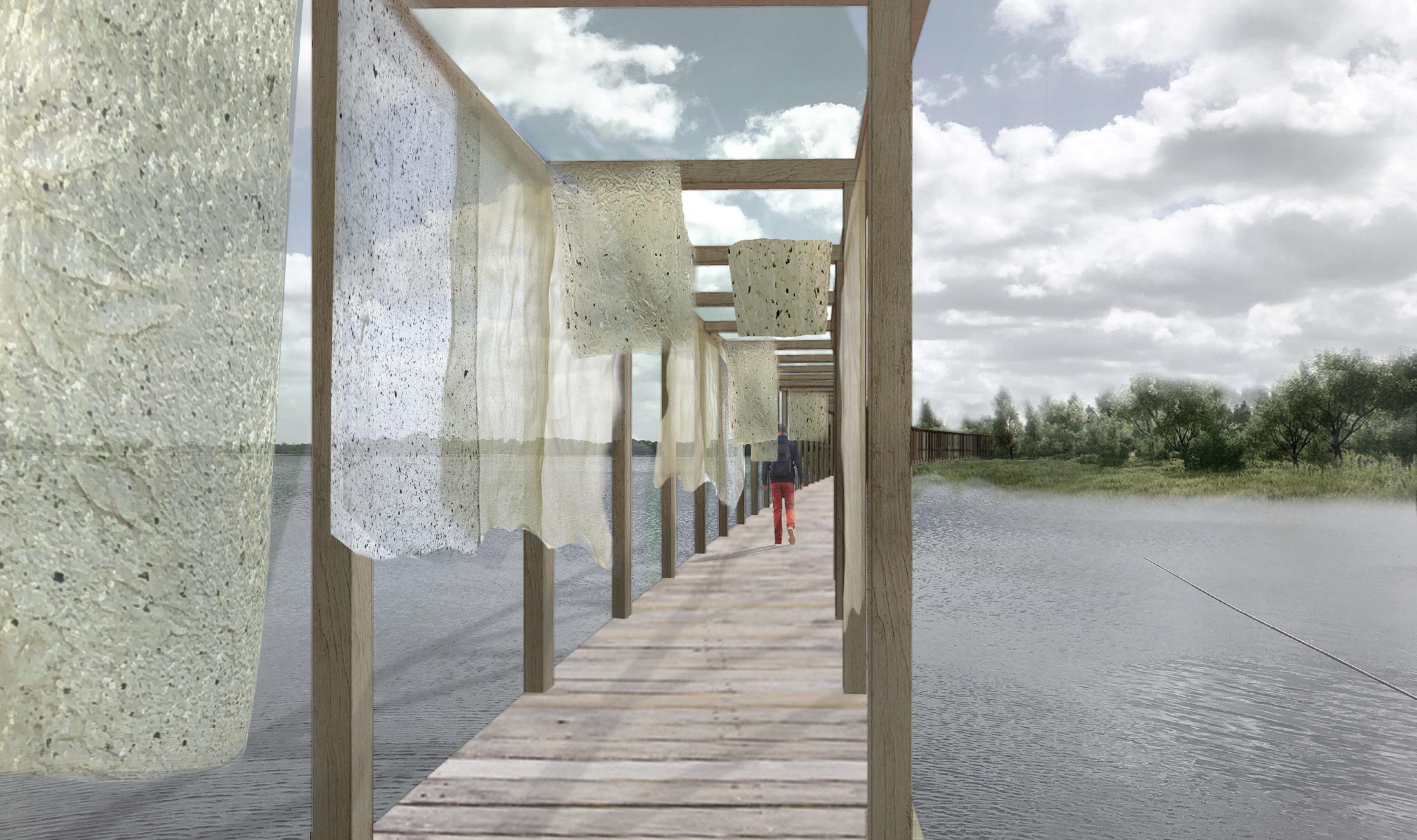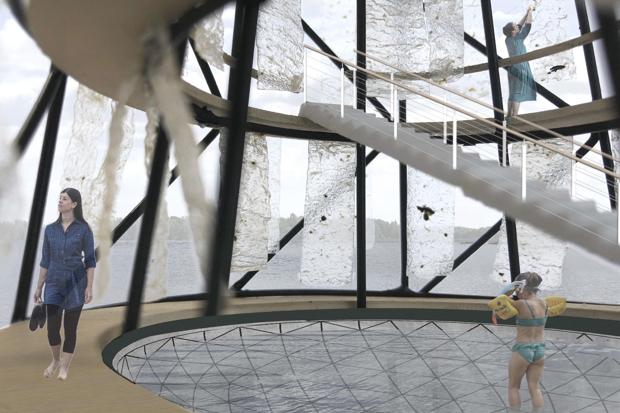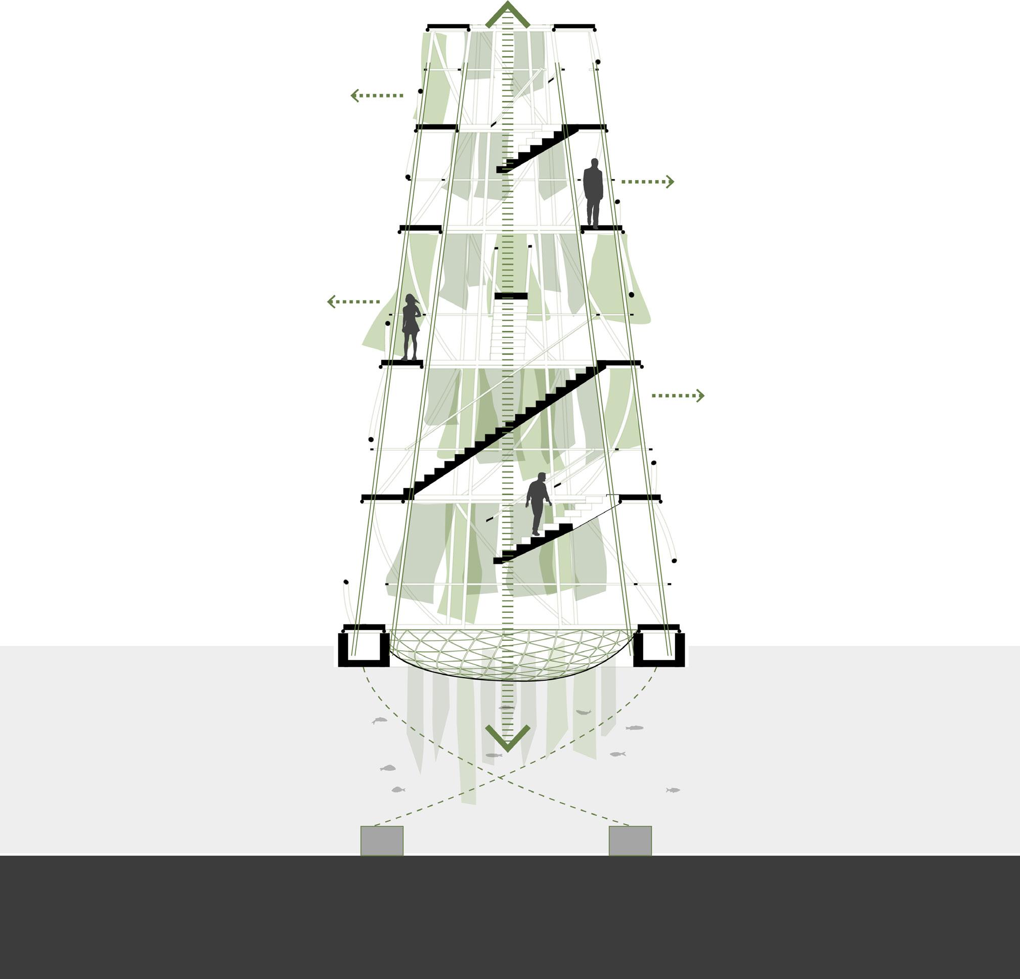 Waving is situated in the middle of the water at Het Twiske. The lightness and the transparency of algae is recognized in this tower. A flurry of algae fabric strips waved like pennants in the breeze, inviting visitors to carefully wove through this kelpforest-liked of translucent algae fabric suspended from metal scaffolding, encountering the same experience of the fish at the bottom of the tower. The curtains are dynamically