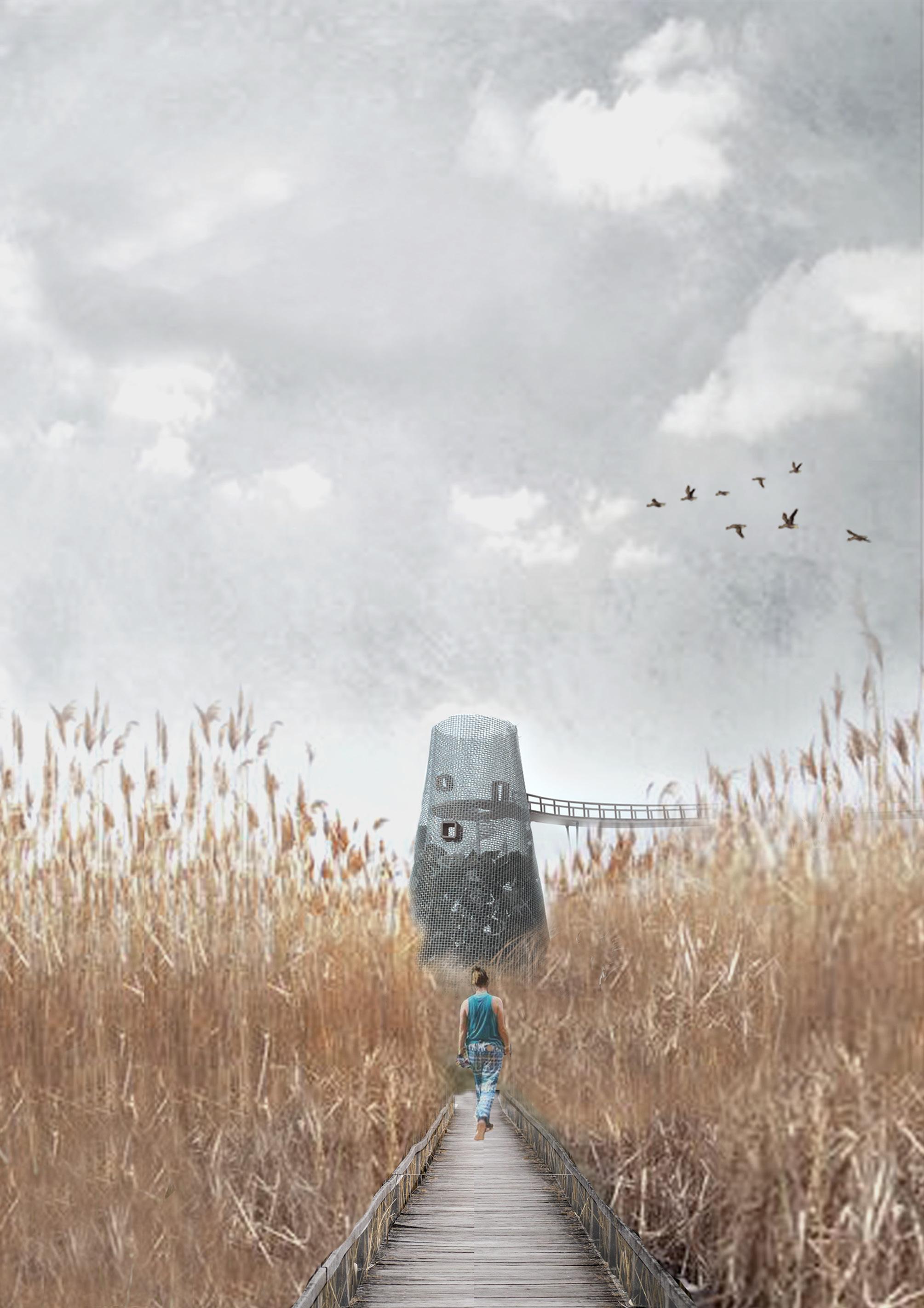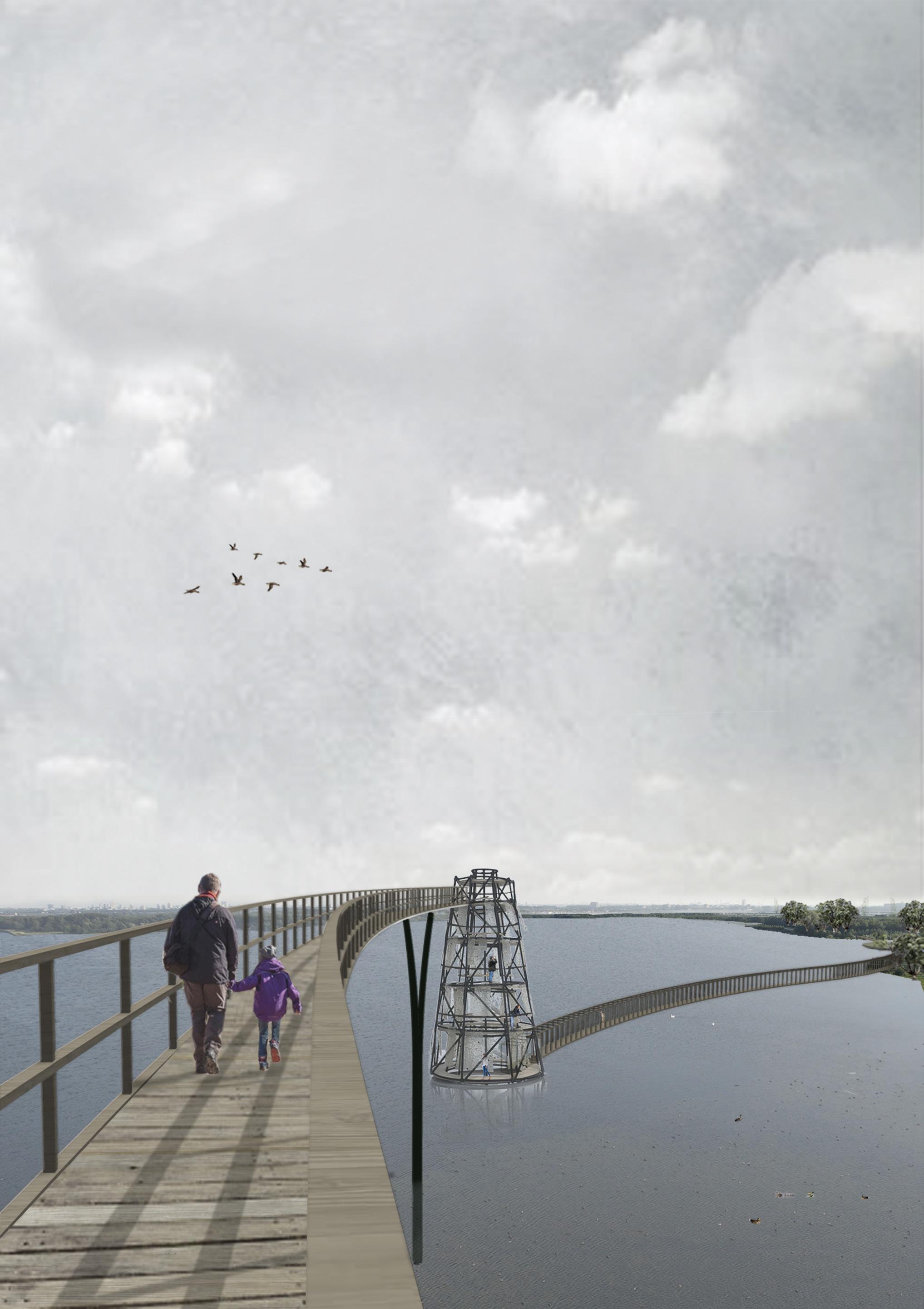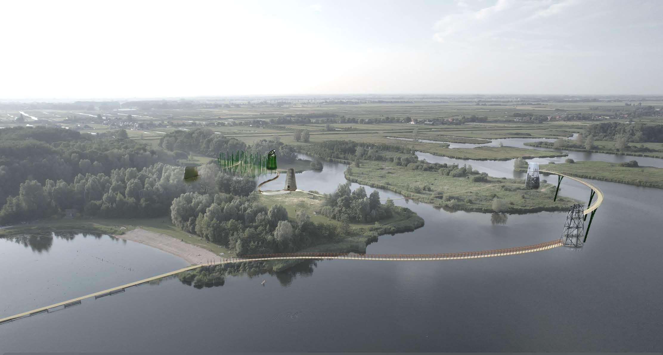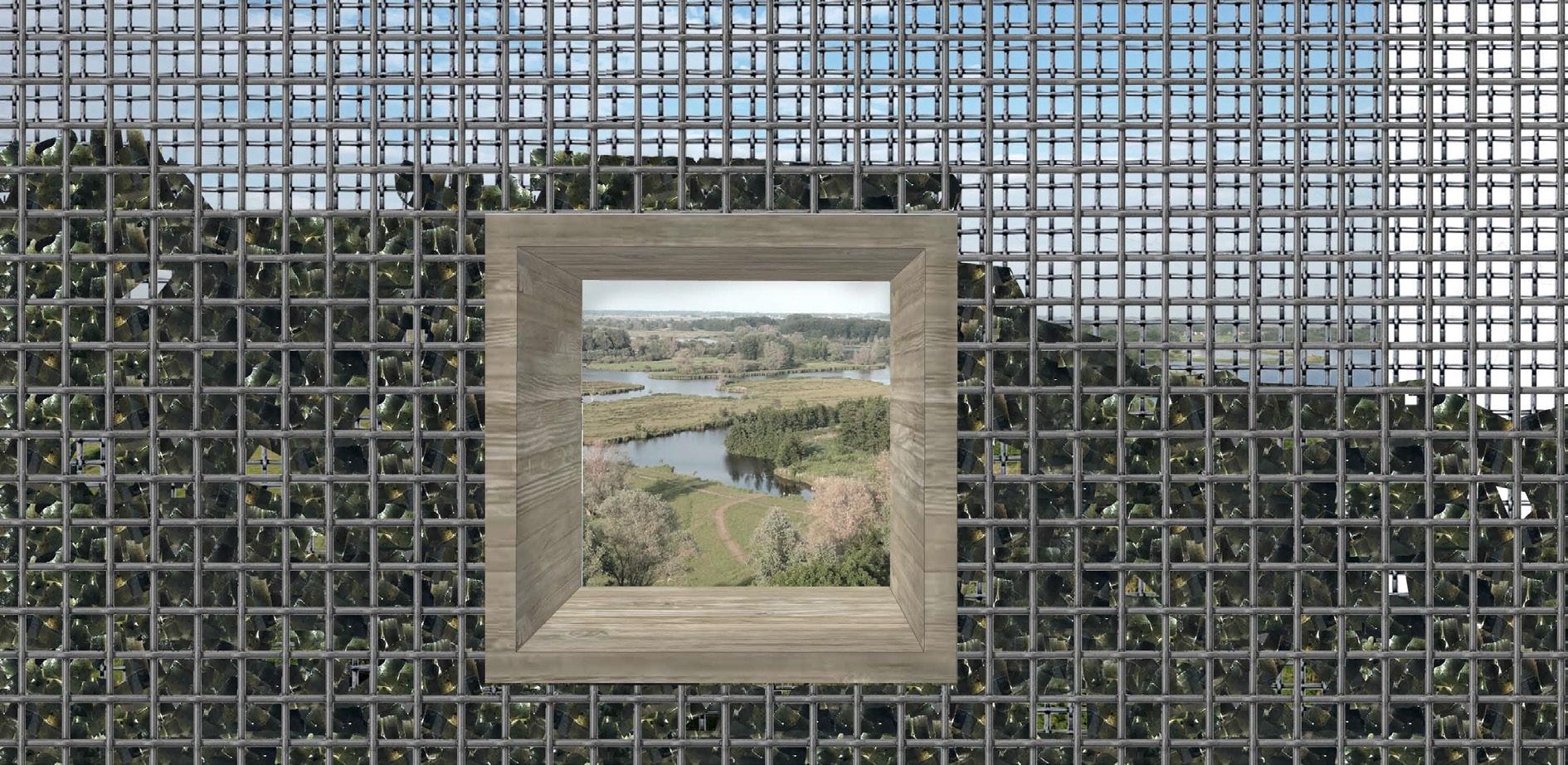 Waving is situated in the middle of the water at Het Twiske. The lightness and the transparency of algae is recognized in this tower. A flurry of algae fabric strips waved like pennants in the breeze, inviting visitors to carefully wove through this kelpforest-liked of translucent algae fabric suspended from metal scaffolding, encountering the same experience of the fish at the bottom of the tower. The curtains are dynamically