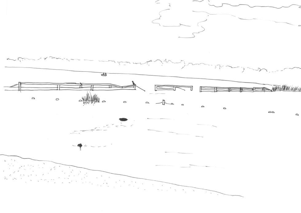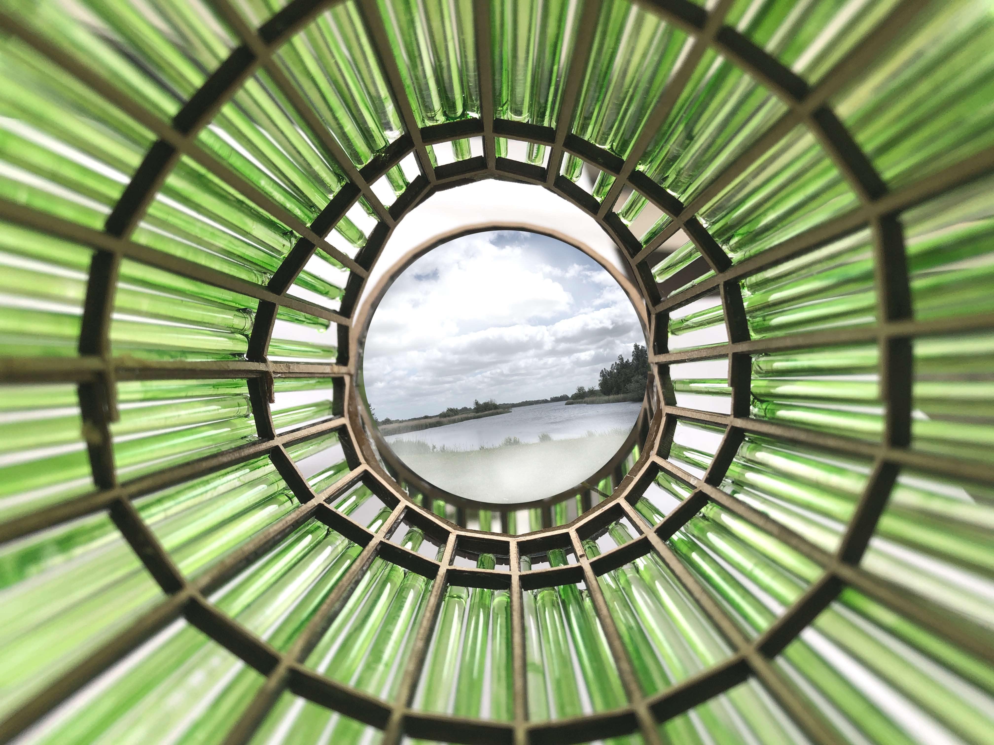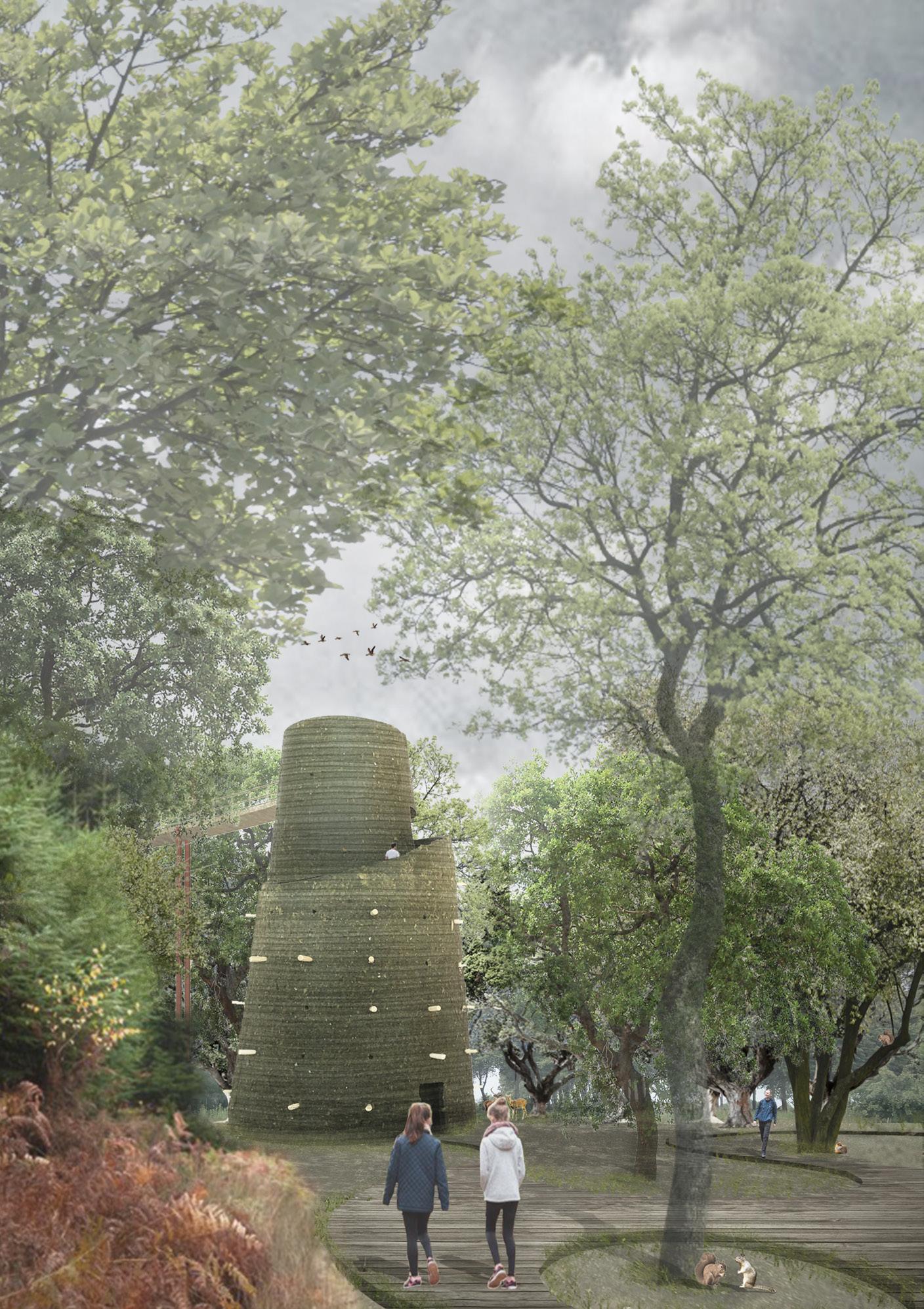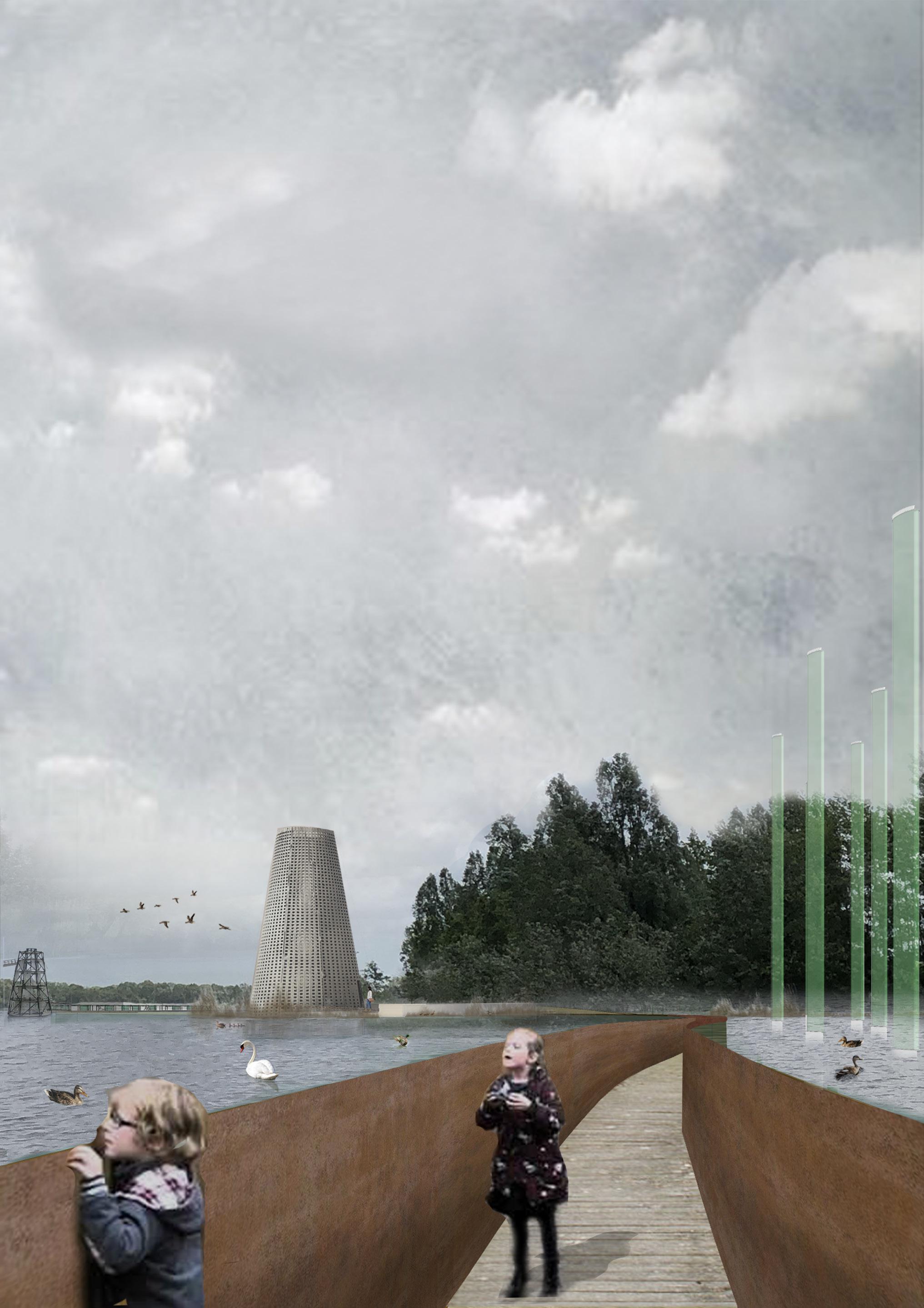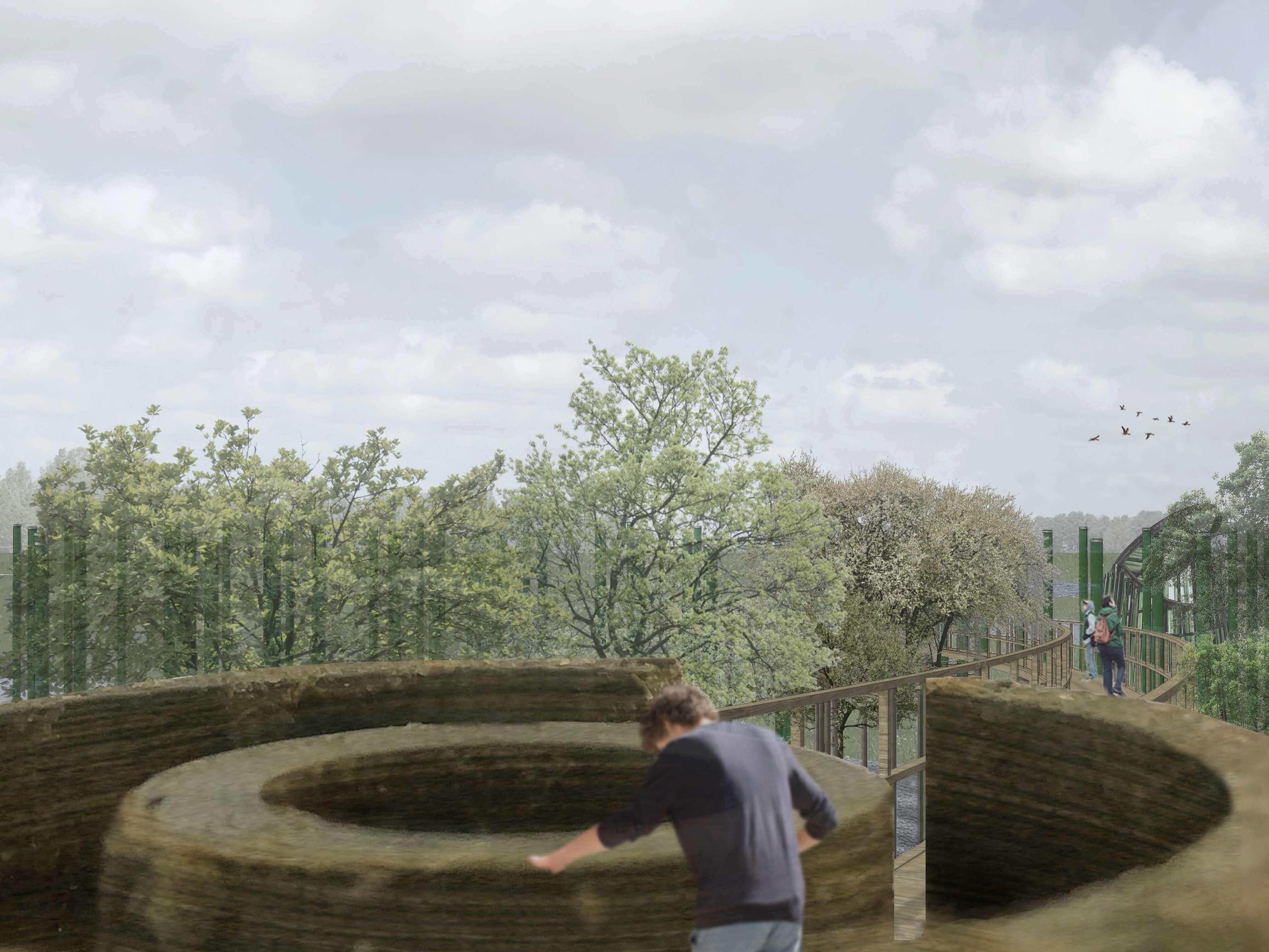 Waving is situated in the middle of the water at Het Twiske. The lightness and the transparency of algae is recognized in this tower. A flurry of algae fabric strips waved like pennants in the breeze, inviting visitors to carefully wove through this kelpforest-liked of translucent algae fabric suspended from metal scaffolding, encountering the same experience of the fish at the bottom of the tower. The curtains are dynamically