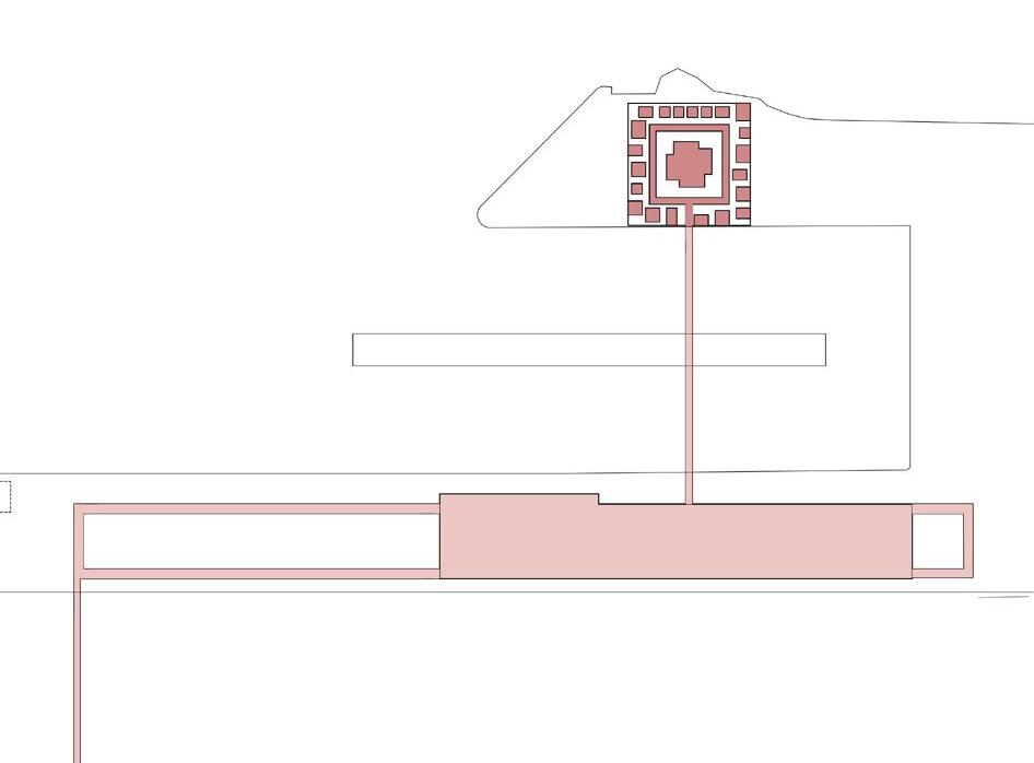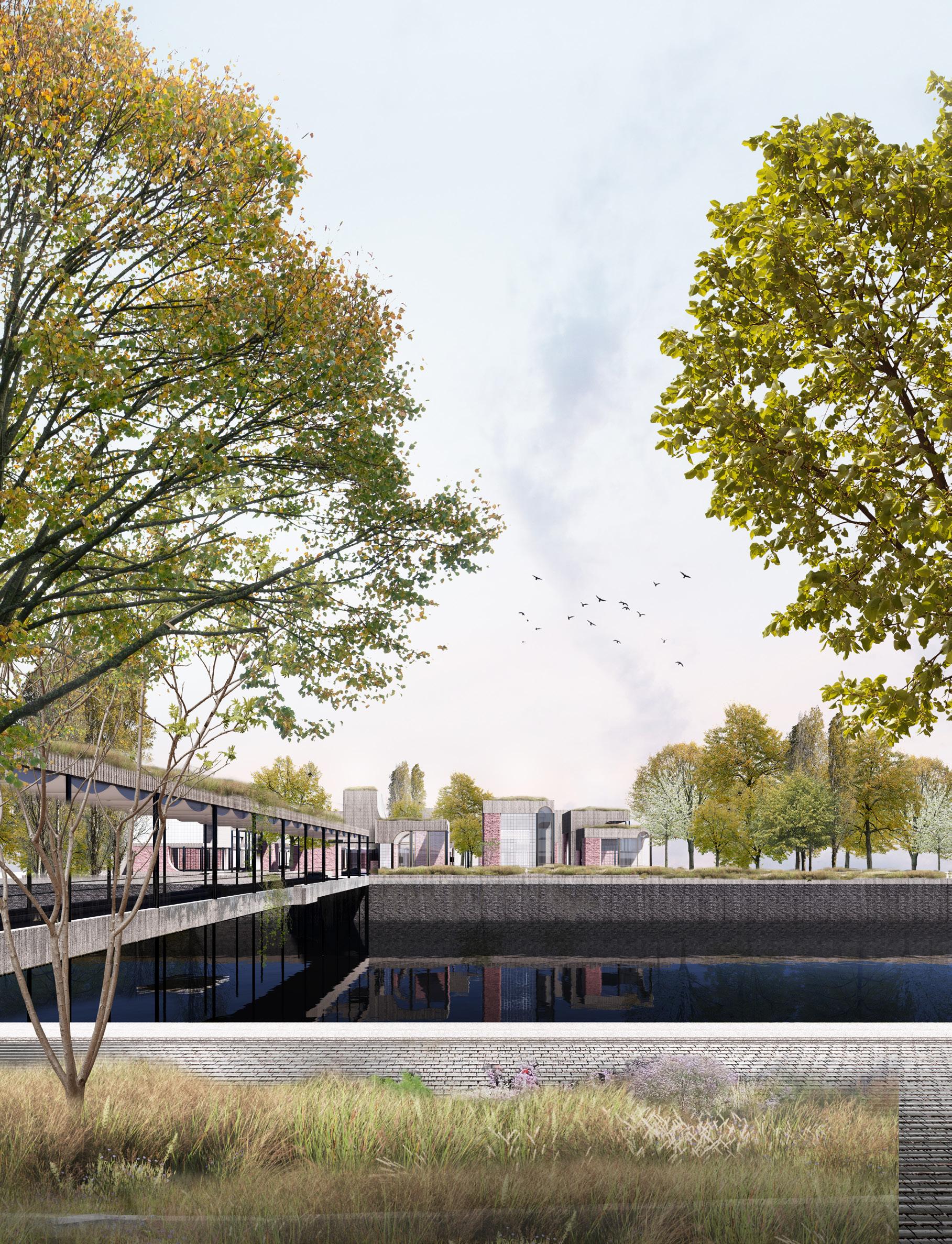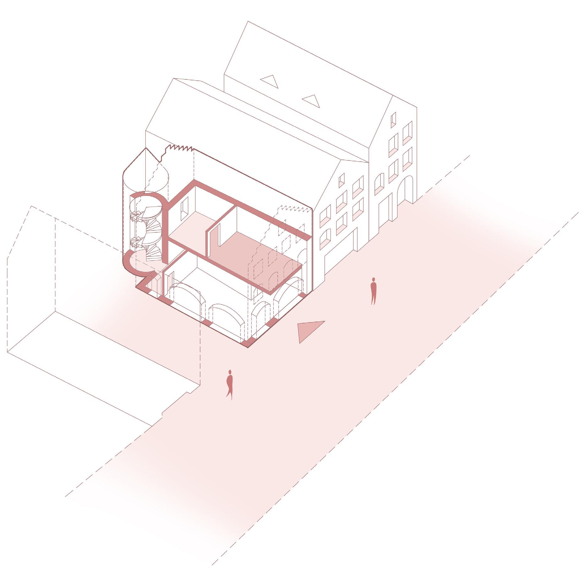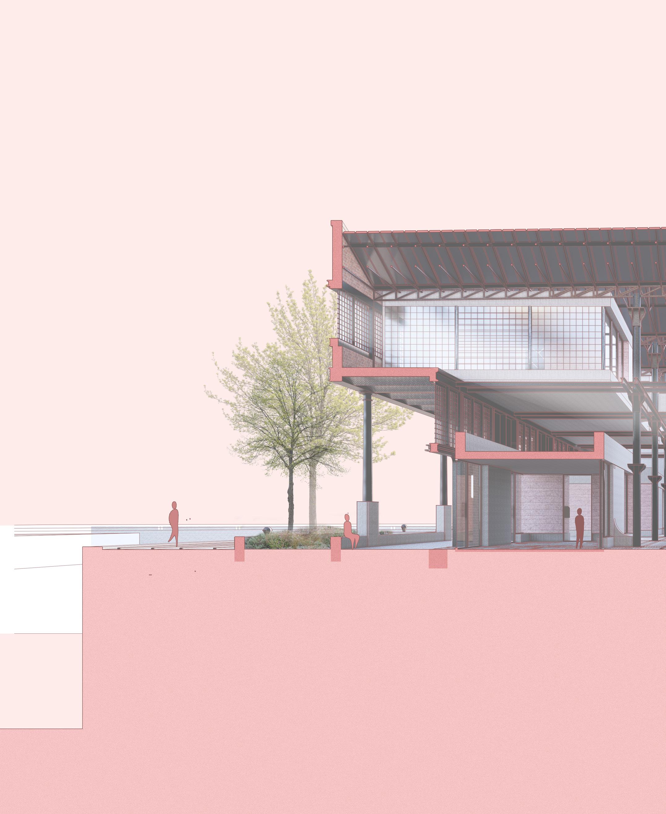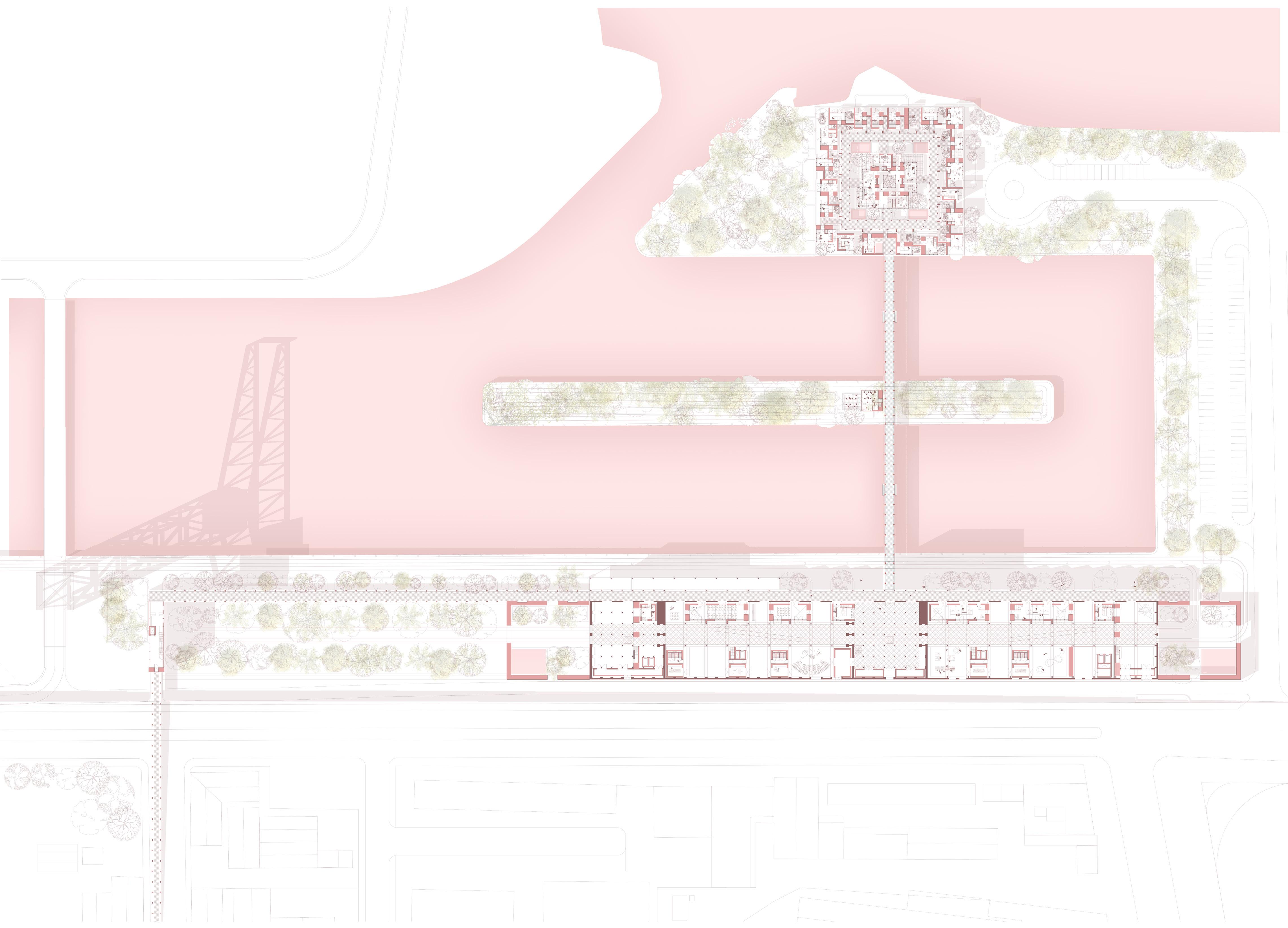 The exhibition spaces integrate with the existing openings and colonnade of the north facade. In doing so, these spaces can interact with the public avenue along the water, meanwhile connecting to the inner high-street.