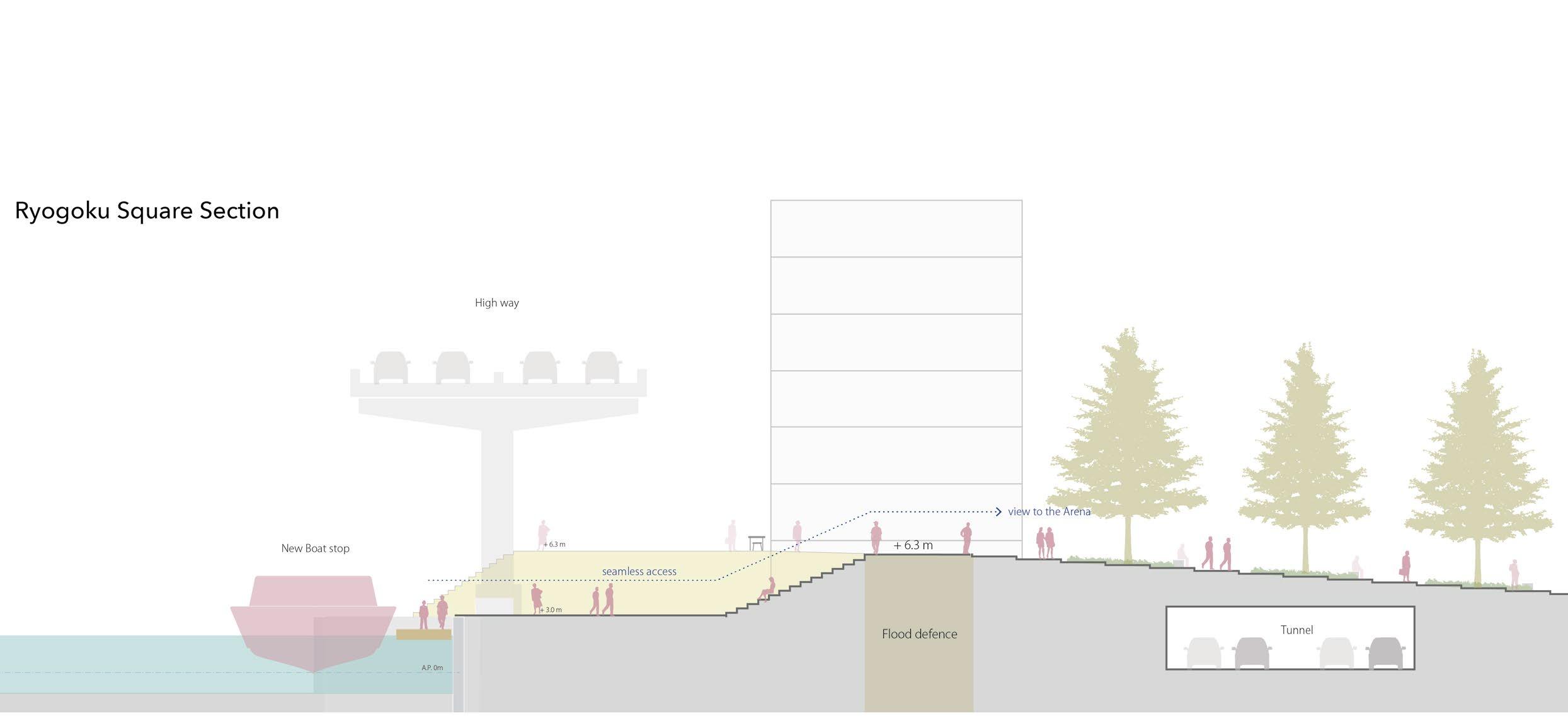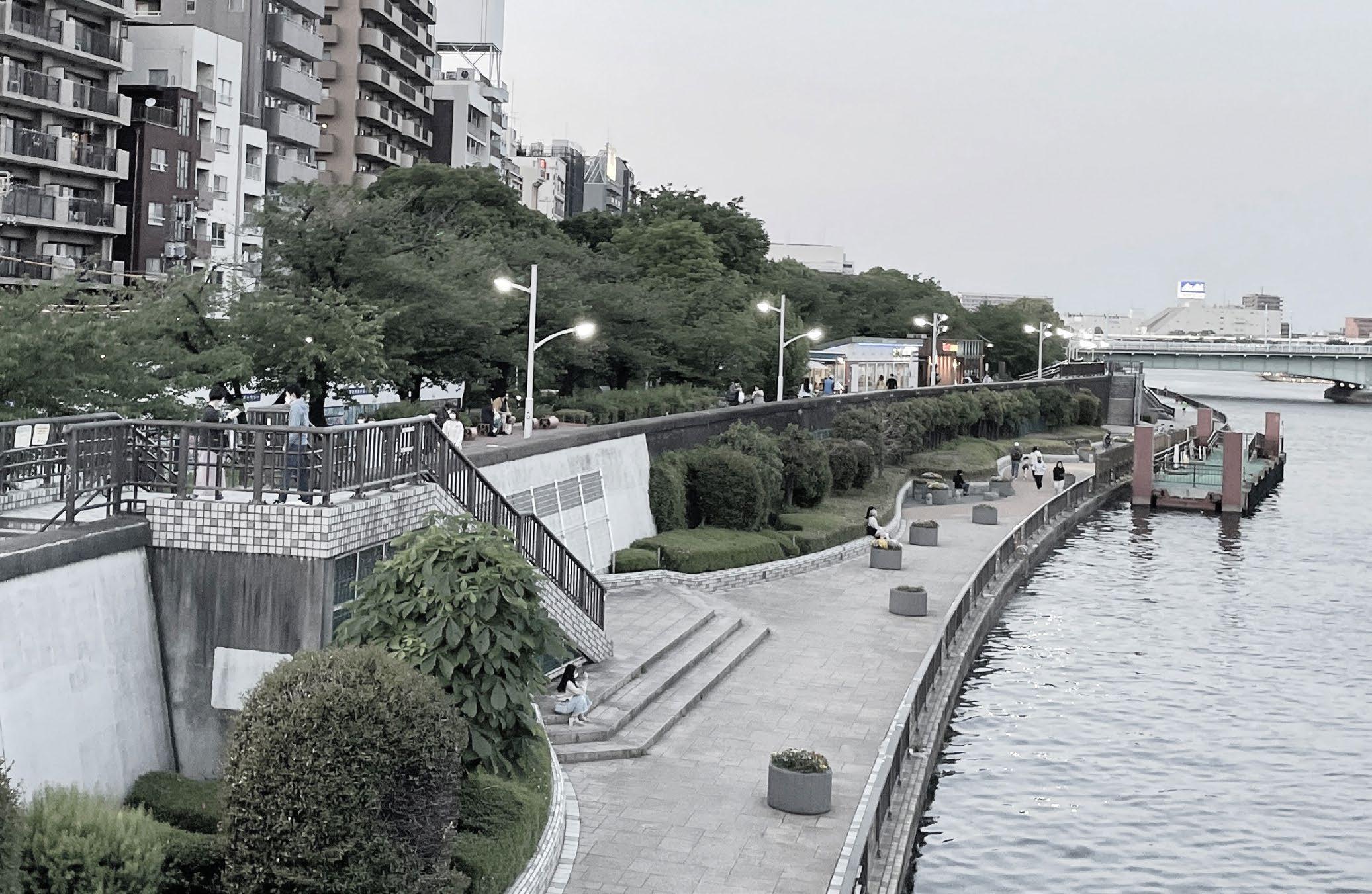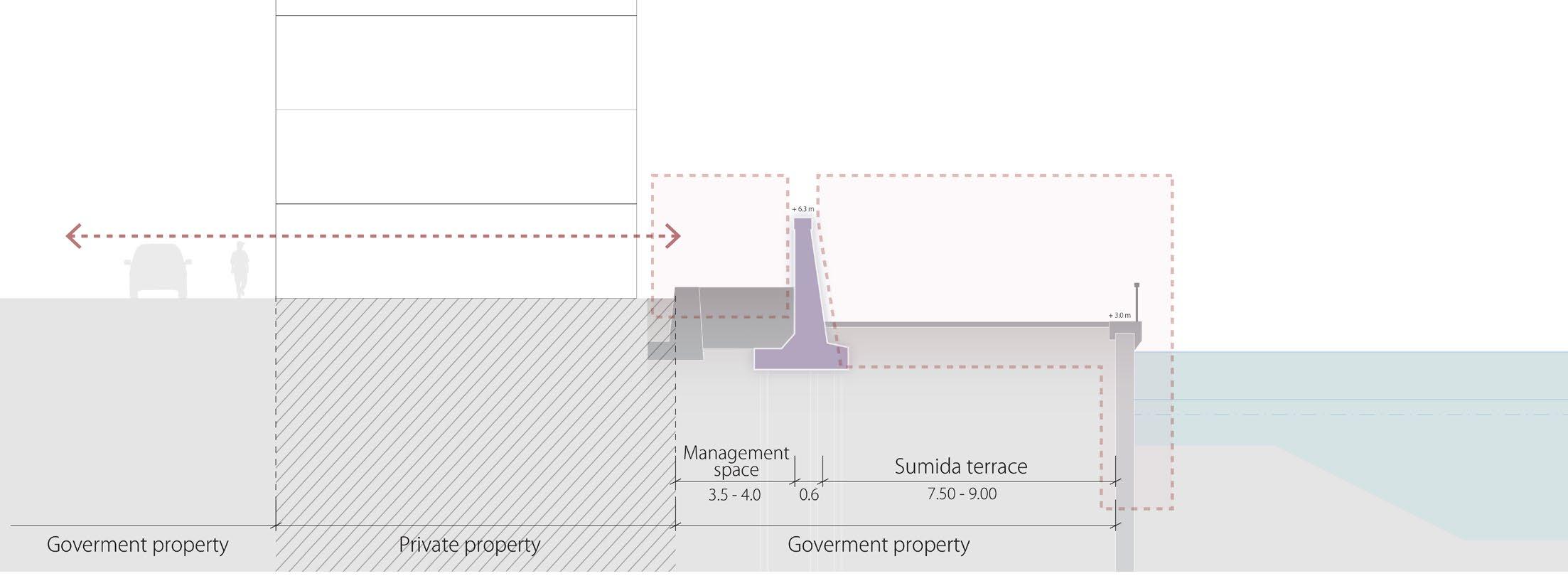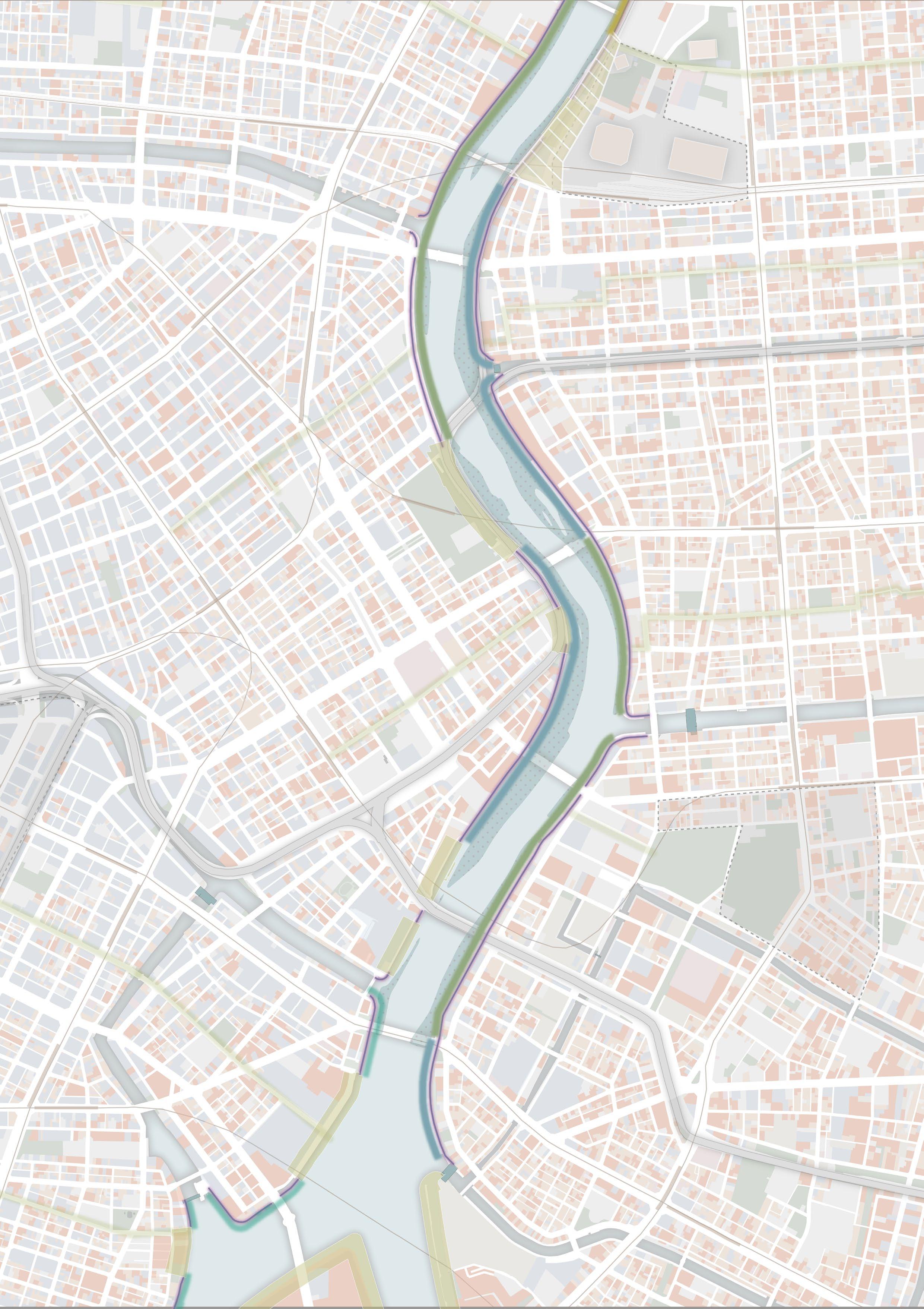 The situation of the waterfront in Tokyo is the same. The Sumida River, one of the huge rivers that flow next to the city centre, is covered by a flood wall, and water cannot be seen from a street. Of course, protecting people from a flood is the most important thing, but improving the quality of the waterfront public space is also important to increase the liveness and quality of life in the city. I believe the balance between flood protection and public space quality is important to make a well-used waterfront space in Tokyo. This project aims to reconnect people to the water in the capital of Tokyo by changing the river public space and its network.