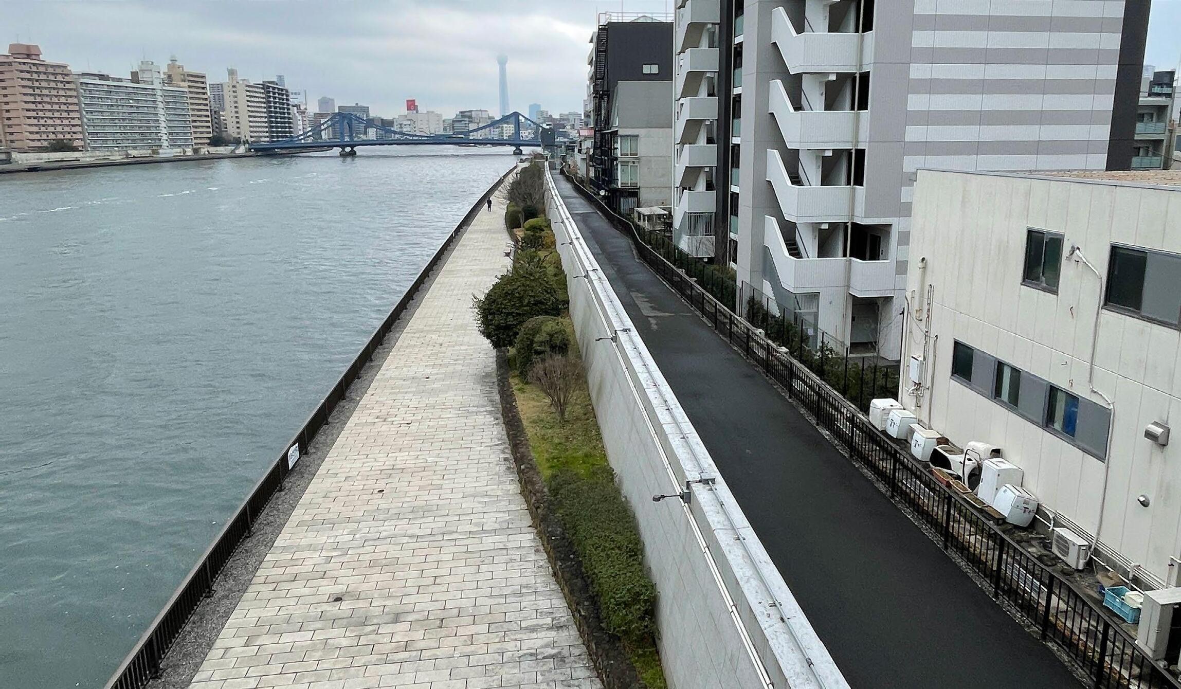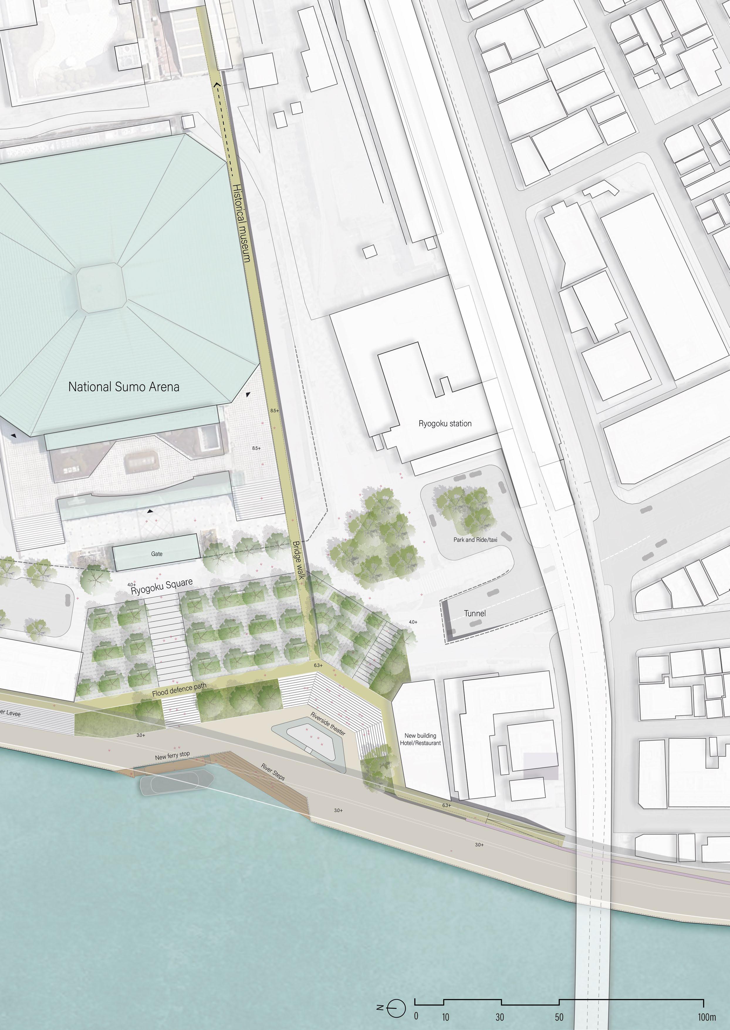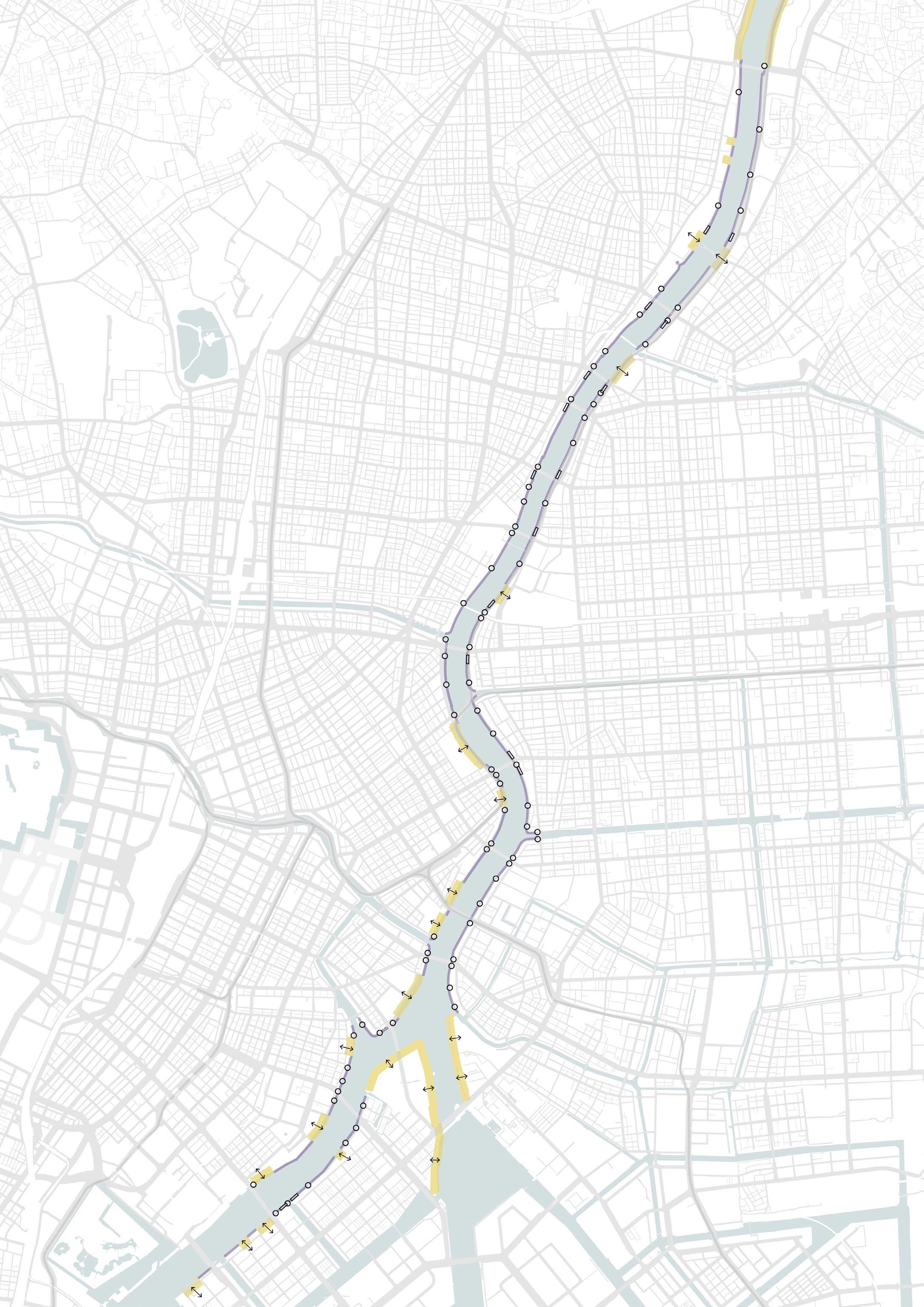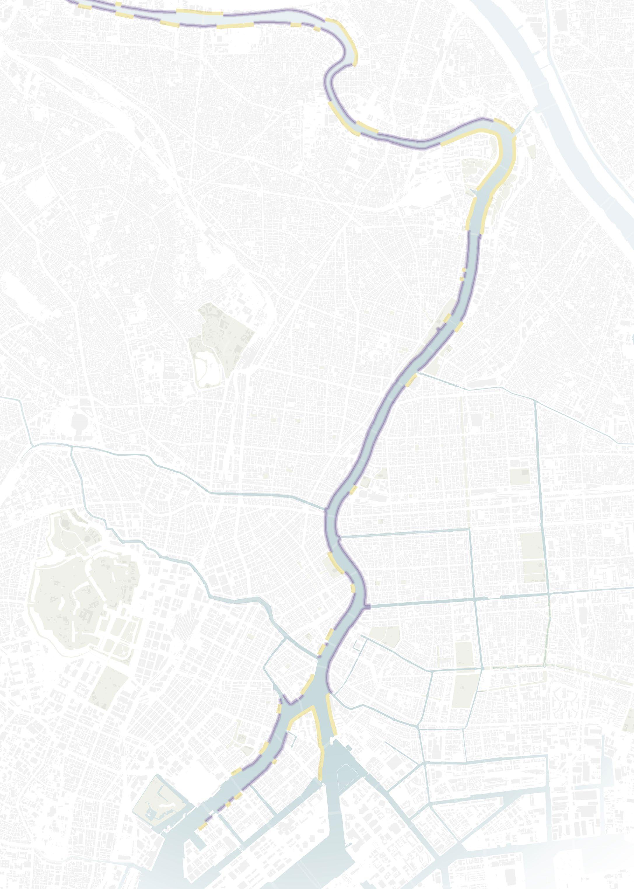 The situation of the waterfront in Tokyo is the same. The Sumida River, one of the huge rivers that flow next to the city centre, is covered by a flood wall, and water cannot be seen from a street. Of course, protecting people from a flood is the most important thing, but improving the quality of the waterfront public space is also important to increase the liveness and quality of life in the city. I believe the balance between flood protection and public space quality is important to make a well-used waterfront space in Tokyo. This project aims to reconnect people to the water in the capital of Tokyo by changing the river public space and its network.