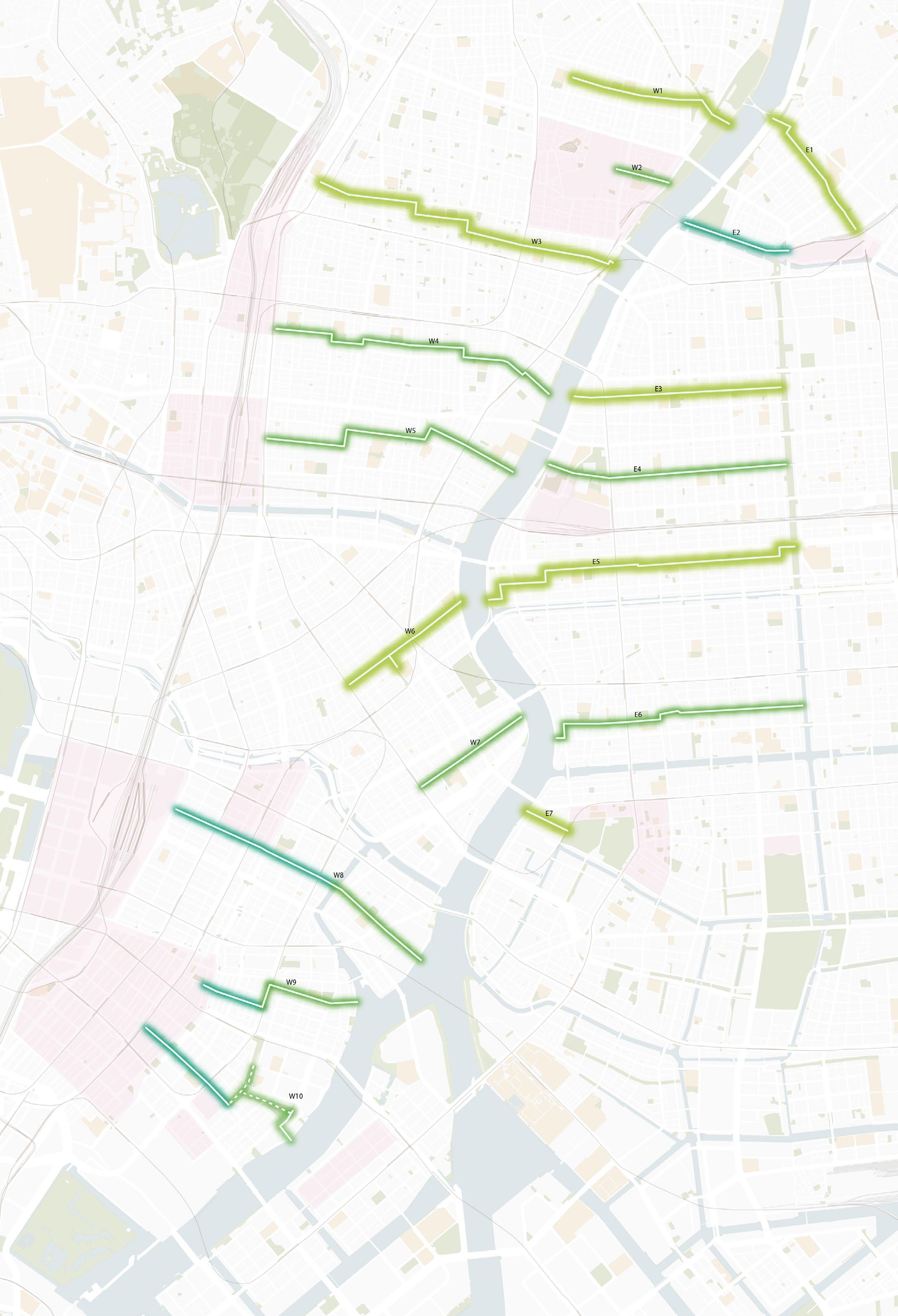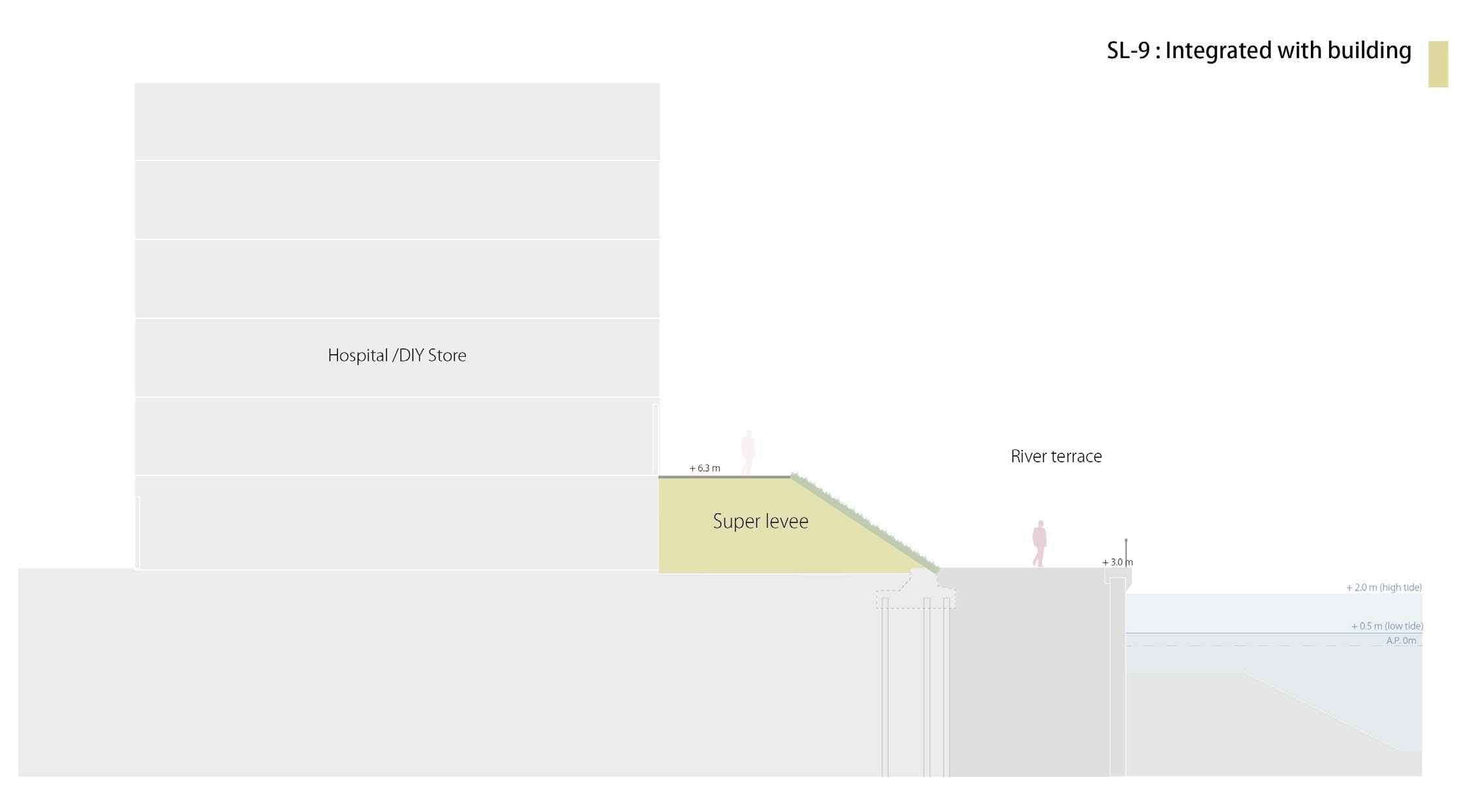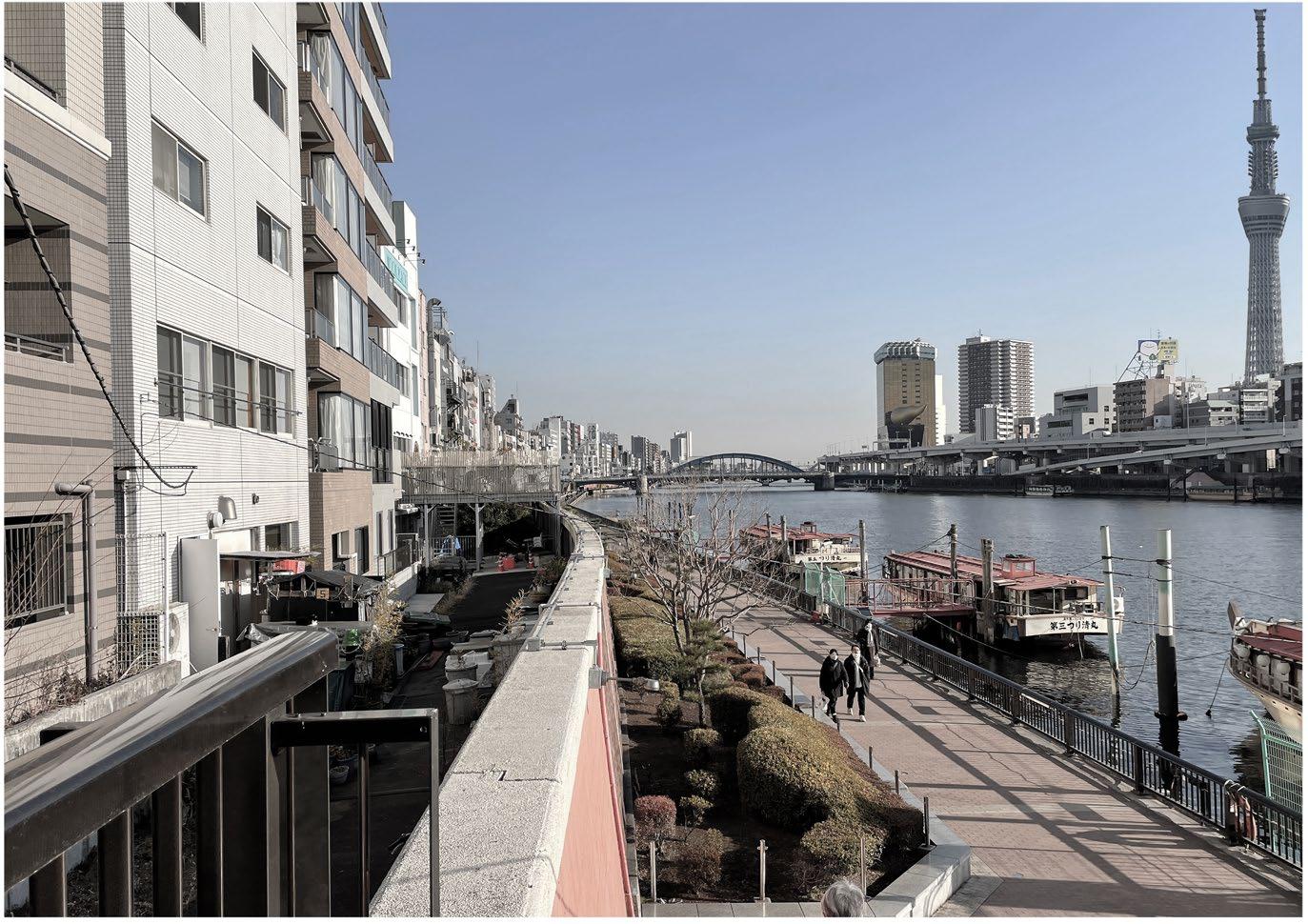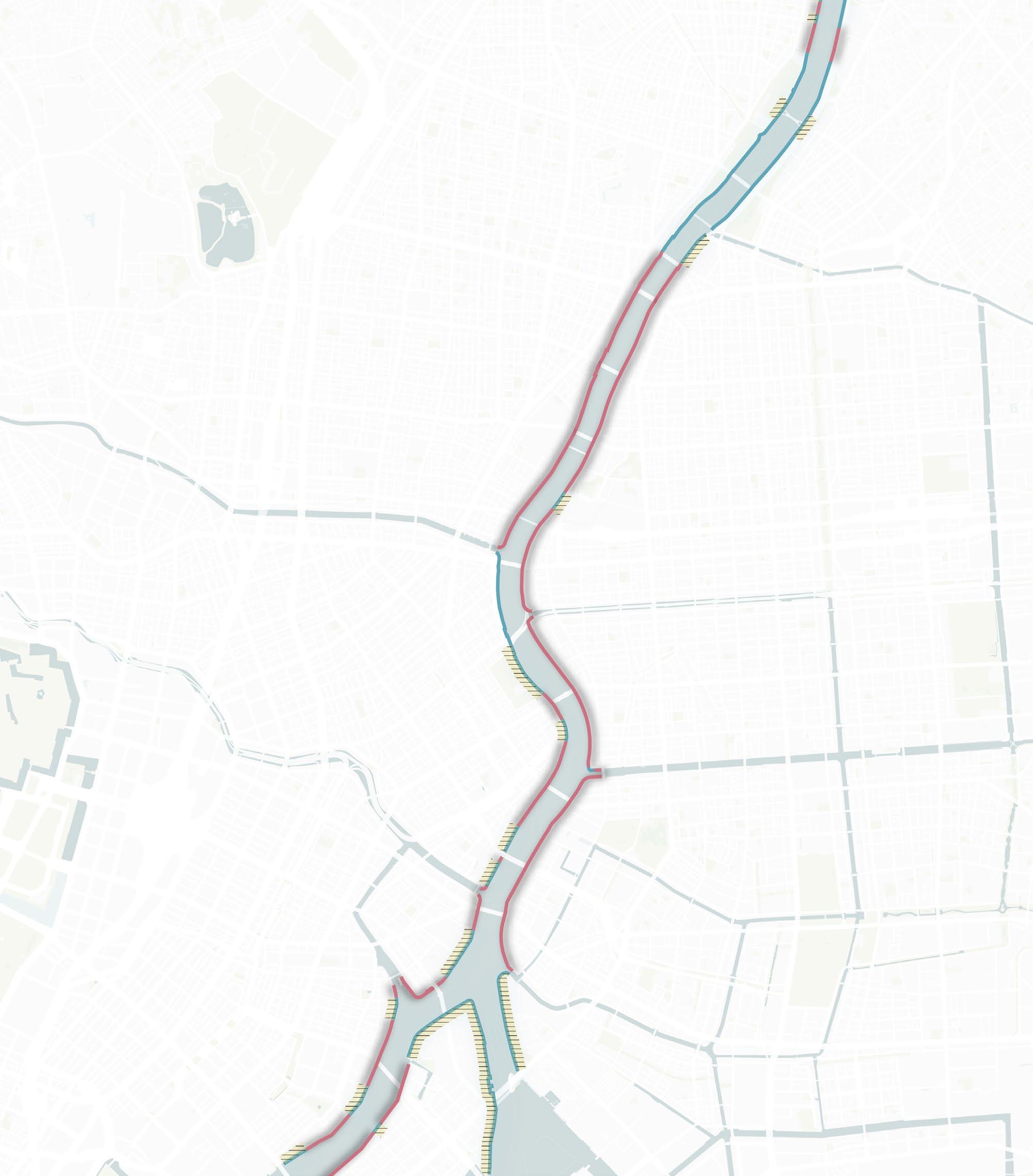 The situation of the waterfront in Tokyo is the same. The Sumida River, one of the huge rivers that flow next to the city centre, is covered by a flood wall, and water cannot be seen from a street. Of course, protecting people from a flood is the most important thing, but improving the quality of the waterfront public space is also important to increase the liveness and quality of life in the city. I believe the balance between flood protection and public space quality is important to make a well-used waterfront space in Tokyo. This project aims to reconnect people to the water in the capital of Tokyo by changing the river public space and its network.