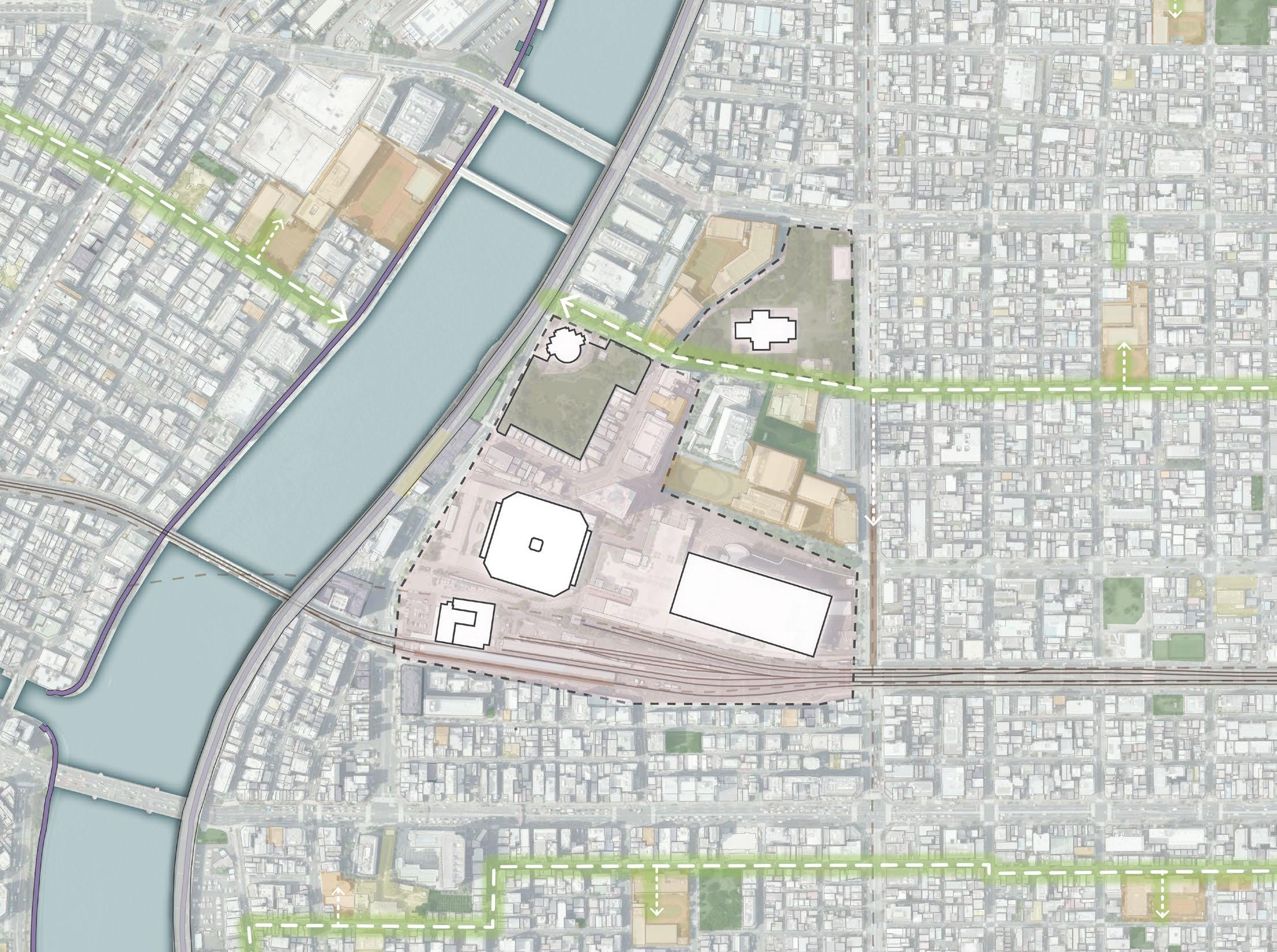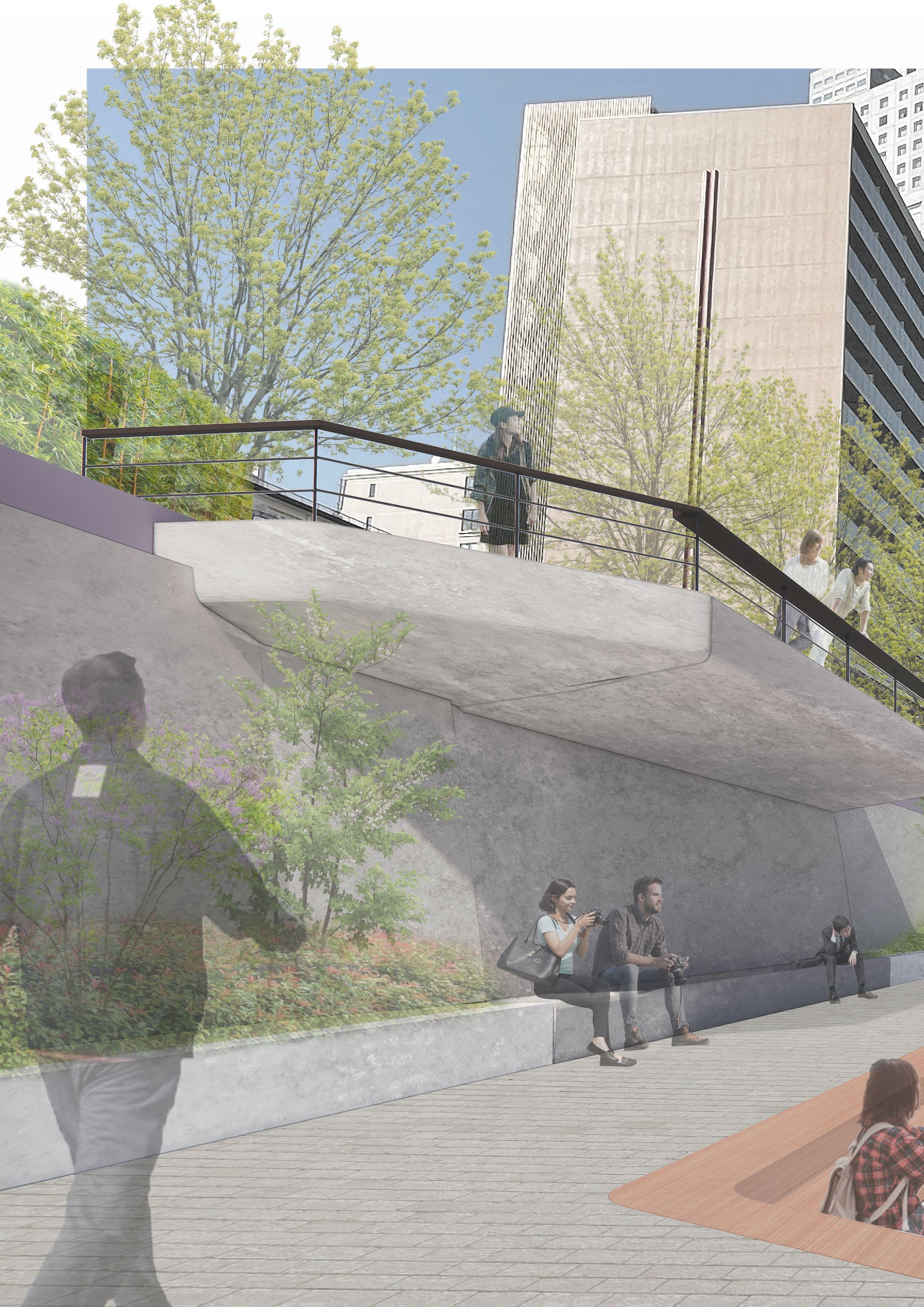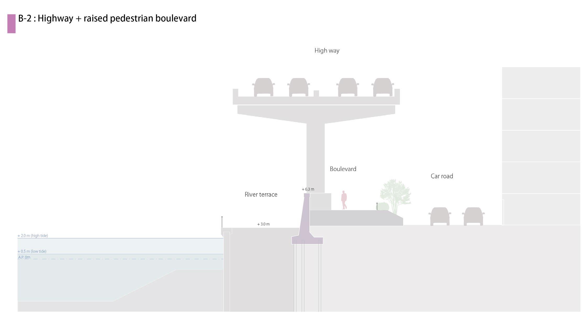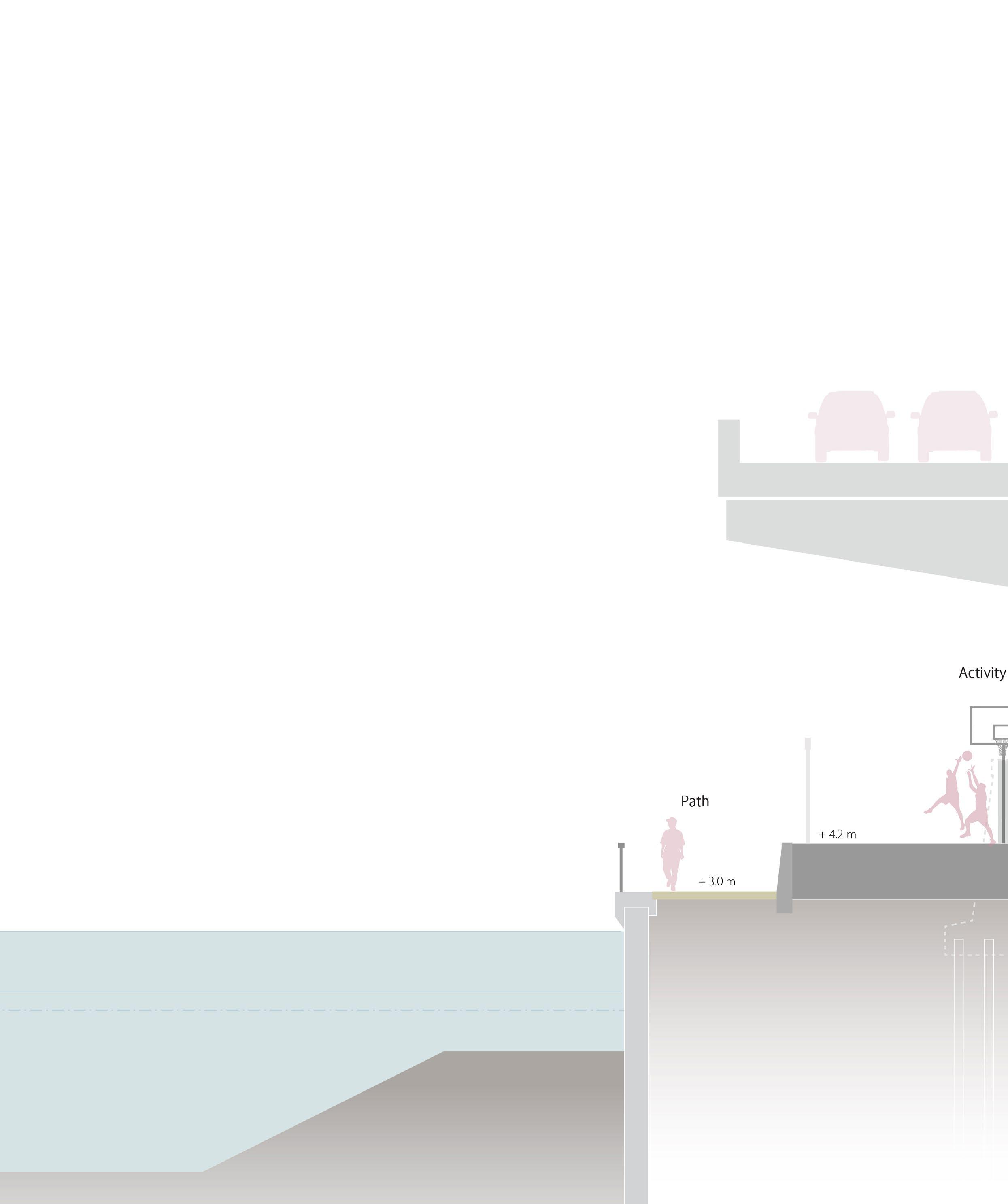 Under the elevated highway, the expanded river space will be designed as Under highway park, serving as a venue for sports, theatre, and playground activities unaffected by rain or intense sunlight. Here, people can enjoy their own activities while overlooking the river.